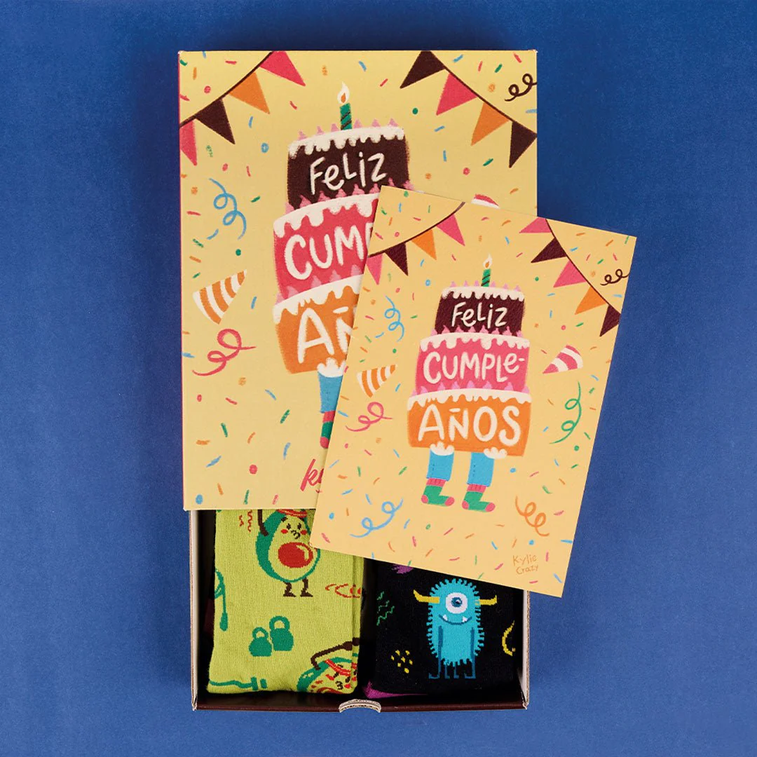 Pack CUMPLEAÑOS 4 pares calcetines divertidos + caja y print incluido