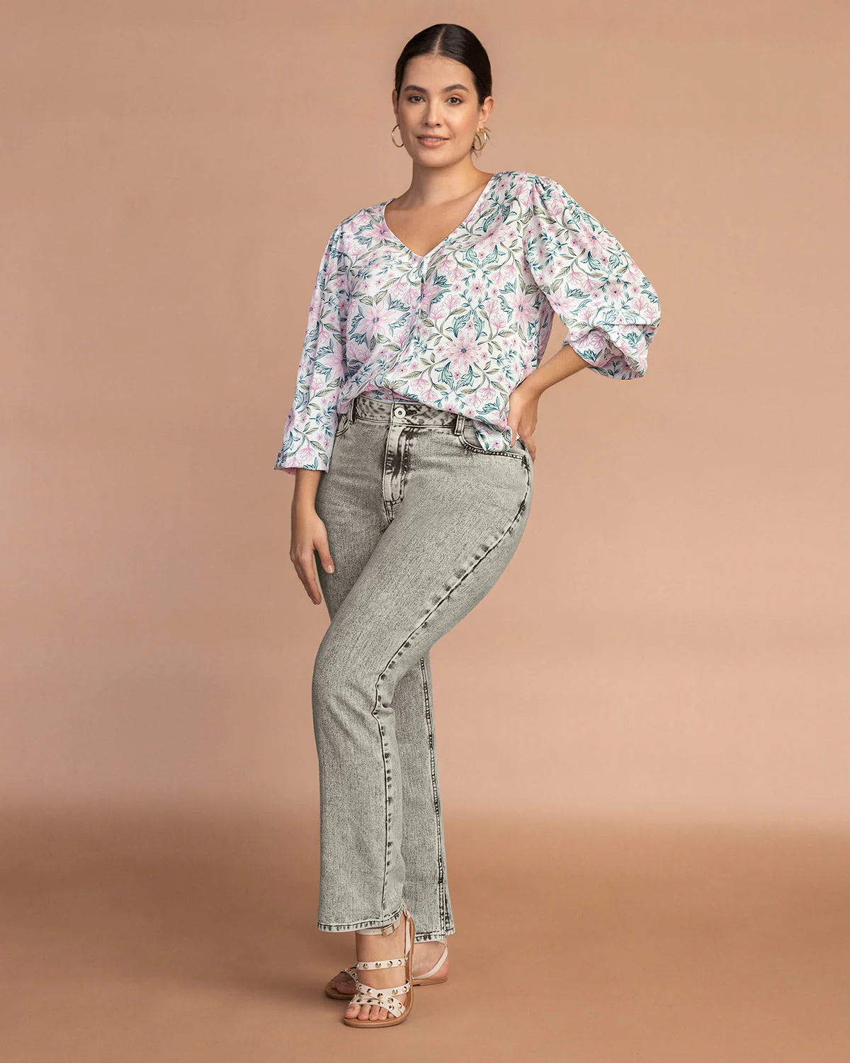 Blusa manga larga estampada cuello en V