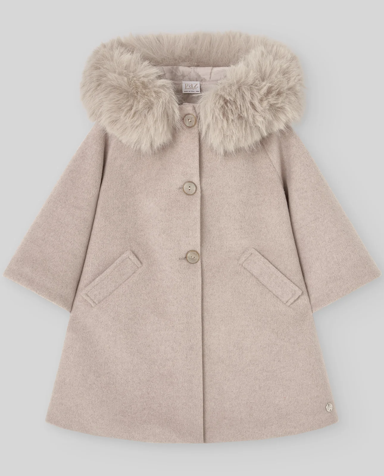 Abrigo de paño con capucha rematada en pelo. Cierre con botones en el frontal, bolsillos laterales y forro interior a contraste.