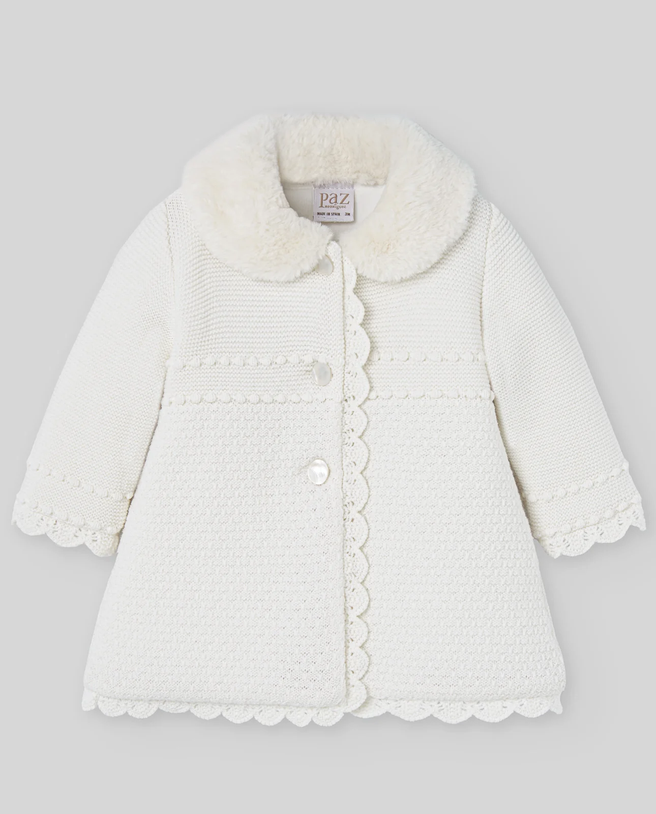 Abrigo de punto con detalle calado en el bajo y en los puños, cuello vuelto de pelo y cierre frontal con botones. Diseño especial para ocasiones señaladas.