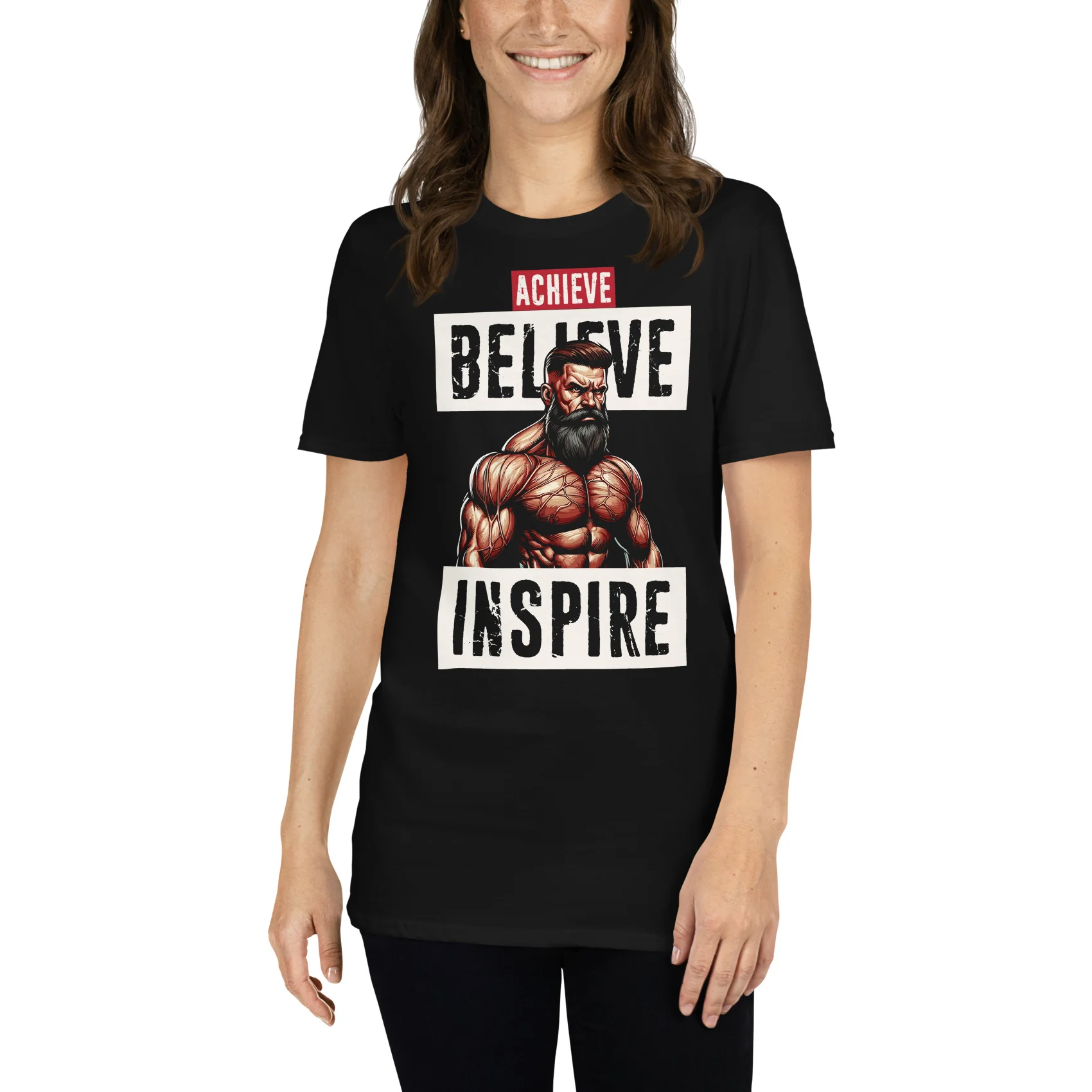 Camiseta con el mensaje Achieve Believe Inspire (Lograr, Creer, Inspirar) perfecta para motivarte en tus entrenamientos en el Gimnasio.