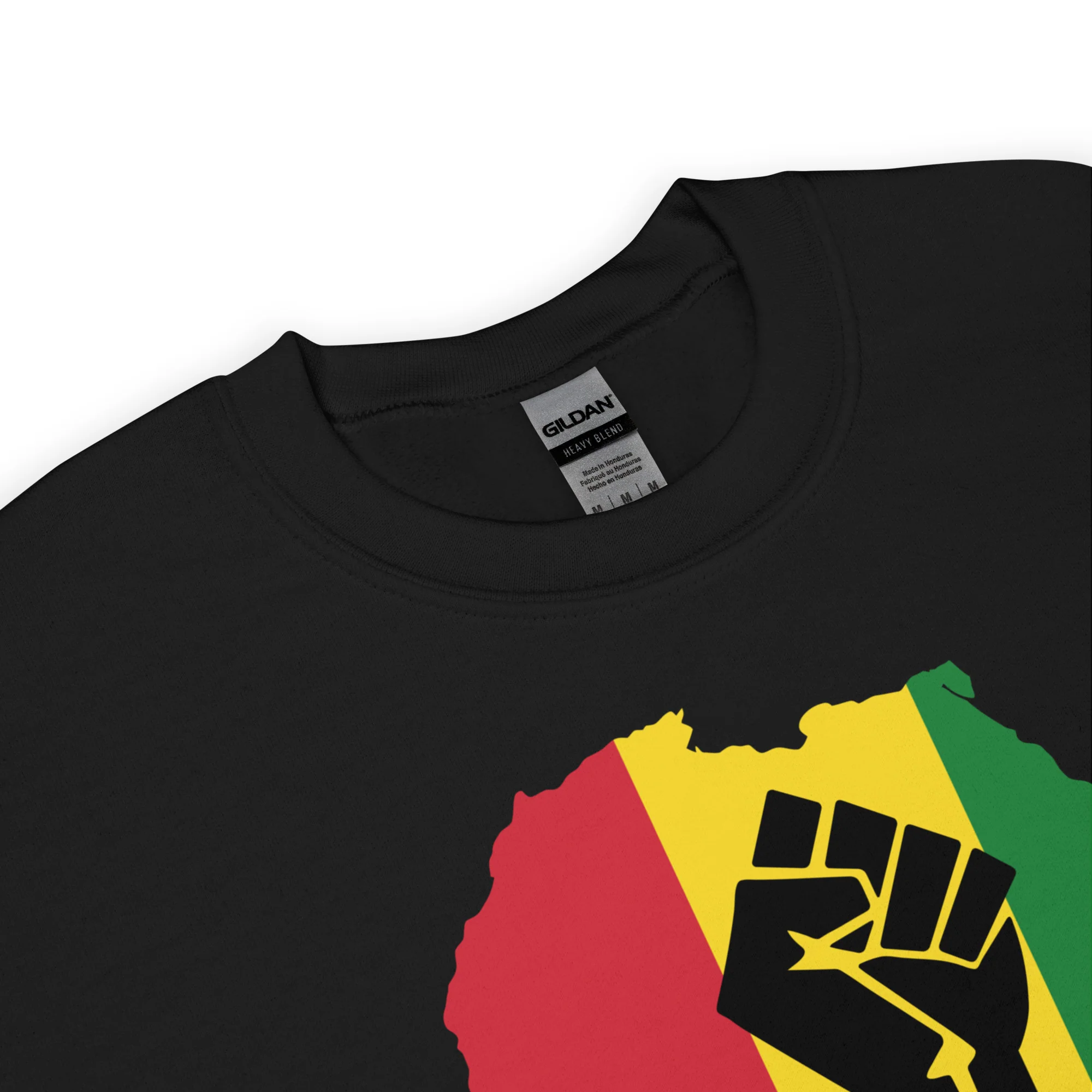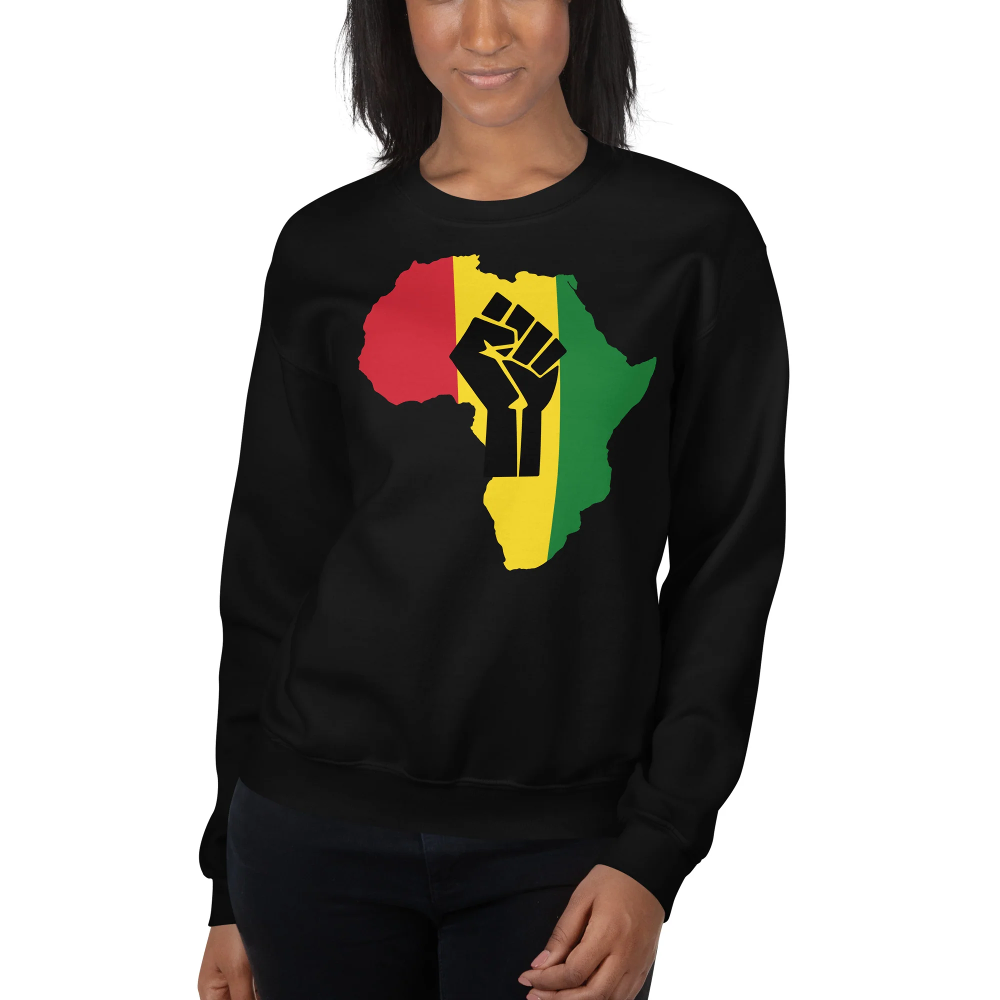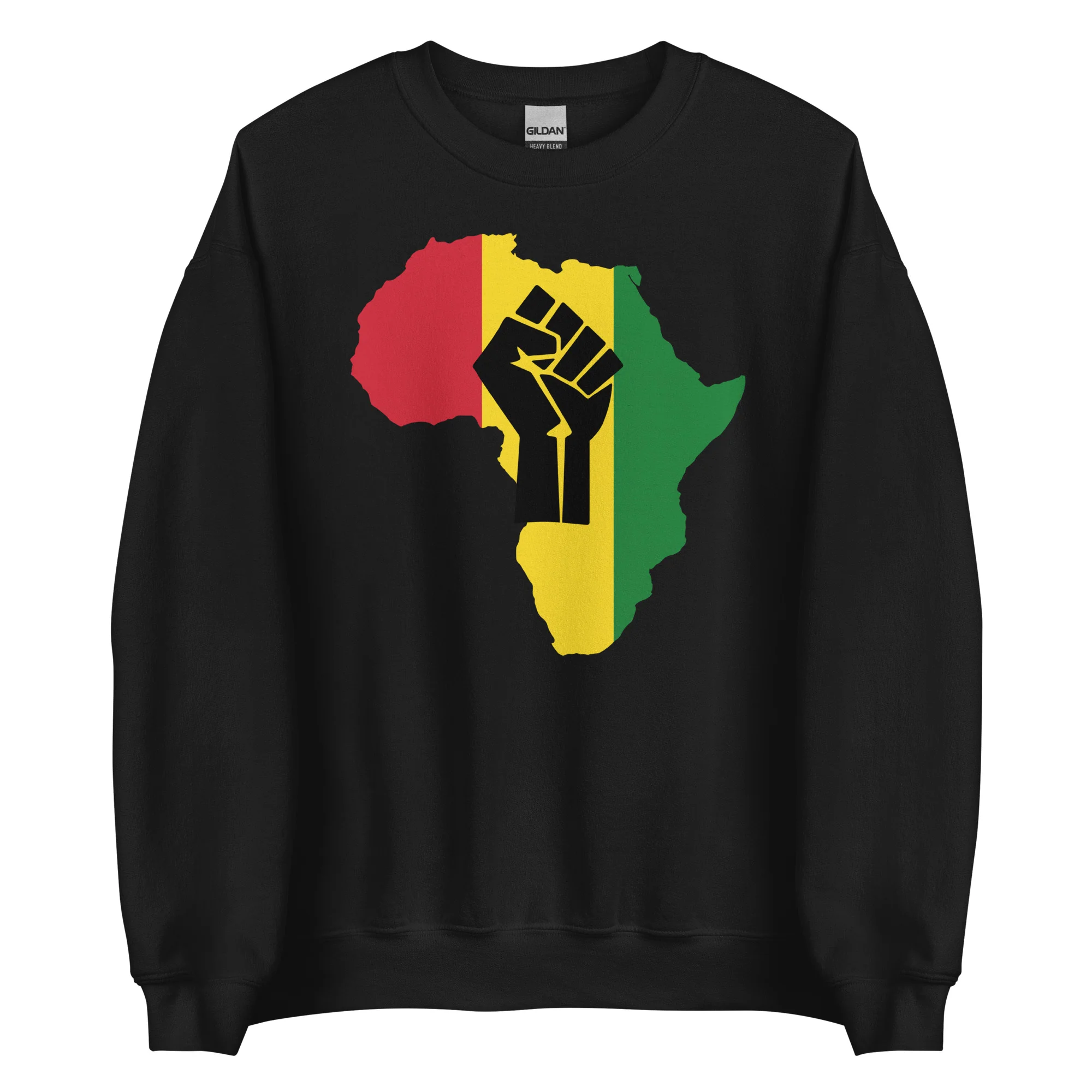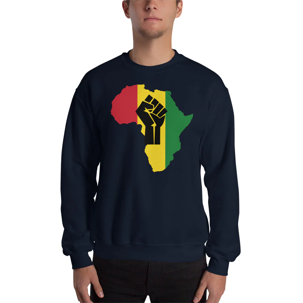Original diseño con un puño en alto sobre el mapa de África con los colores rojo amarillo y verde. El rojo es símbolo de la sangre derramada por los mártires negros, el amarillo se refiere a la riqueza de su tierra y el verde a la abundancia de la vegetación.