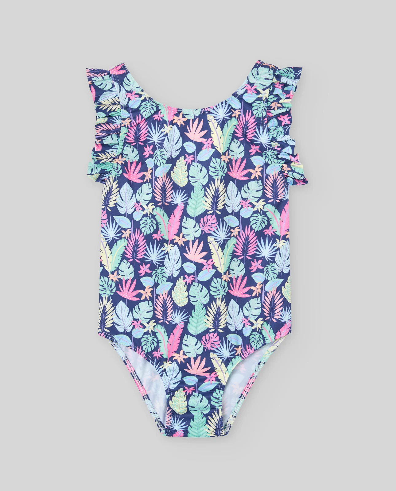 Bañador niña en tejido elástico estampado con motivo tropical con escote a la caja. Volantes en sisas y espalda escotada. Tejido con protección solar.