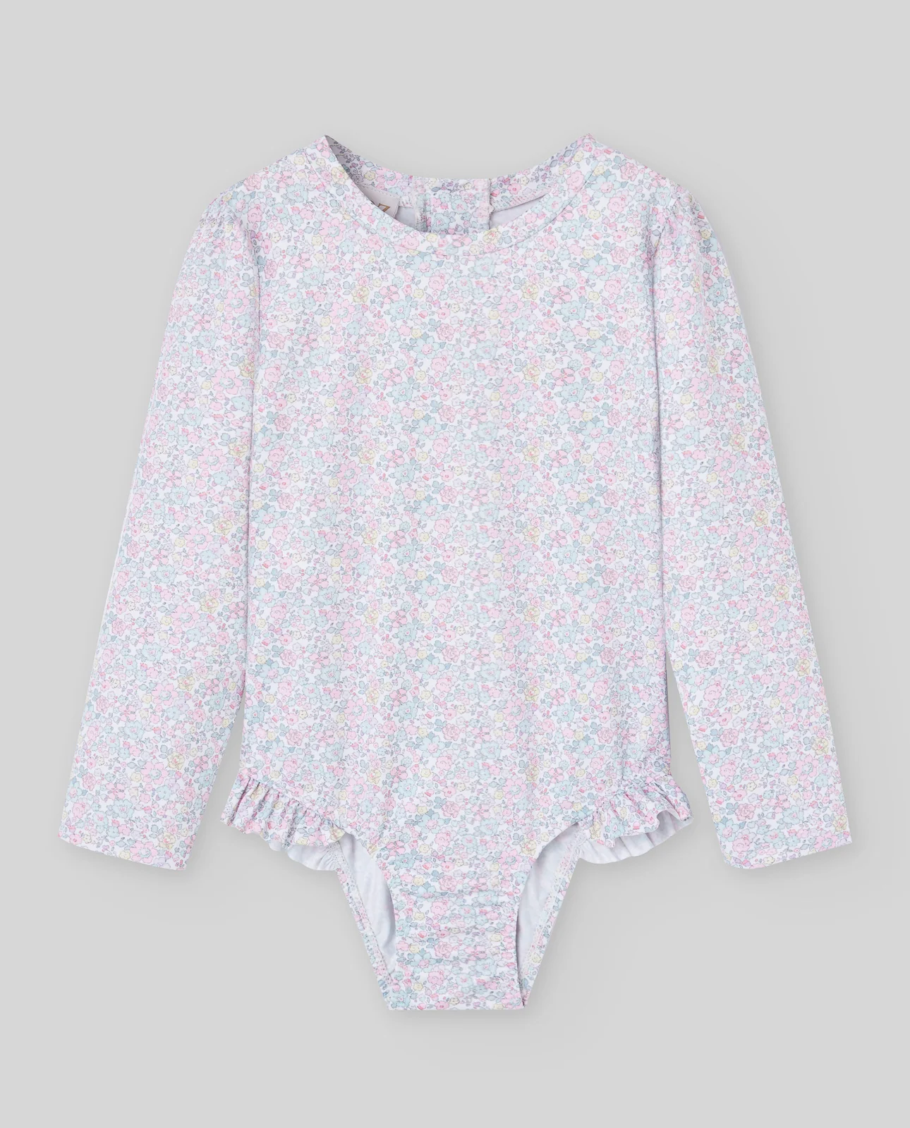 Bañador niña de manga larga en tejido elástico estampado con motivo floral tipo liberty con cierre espalda corchetes.
