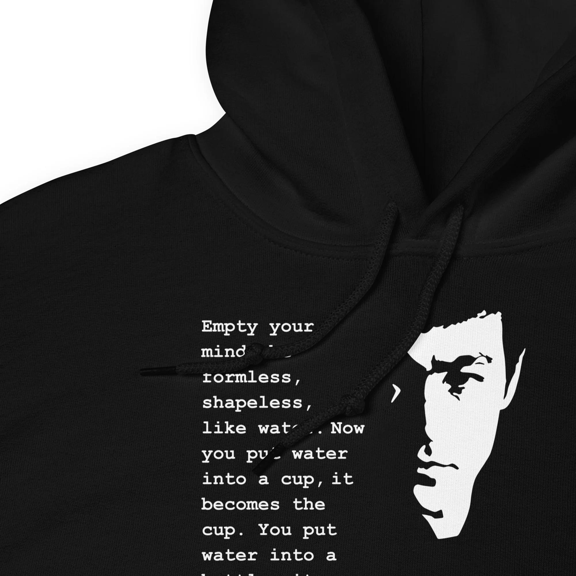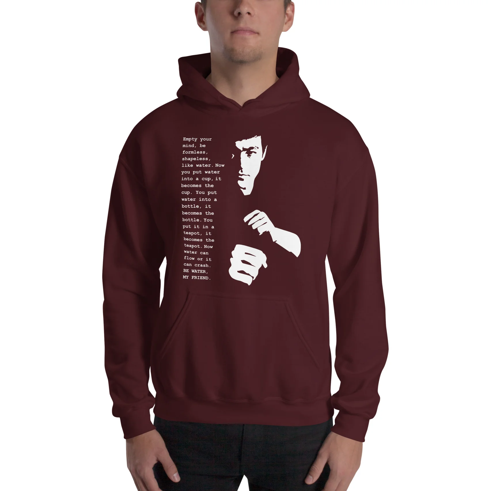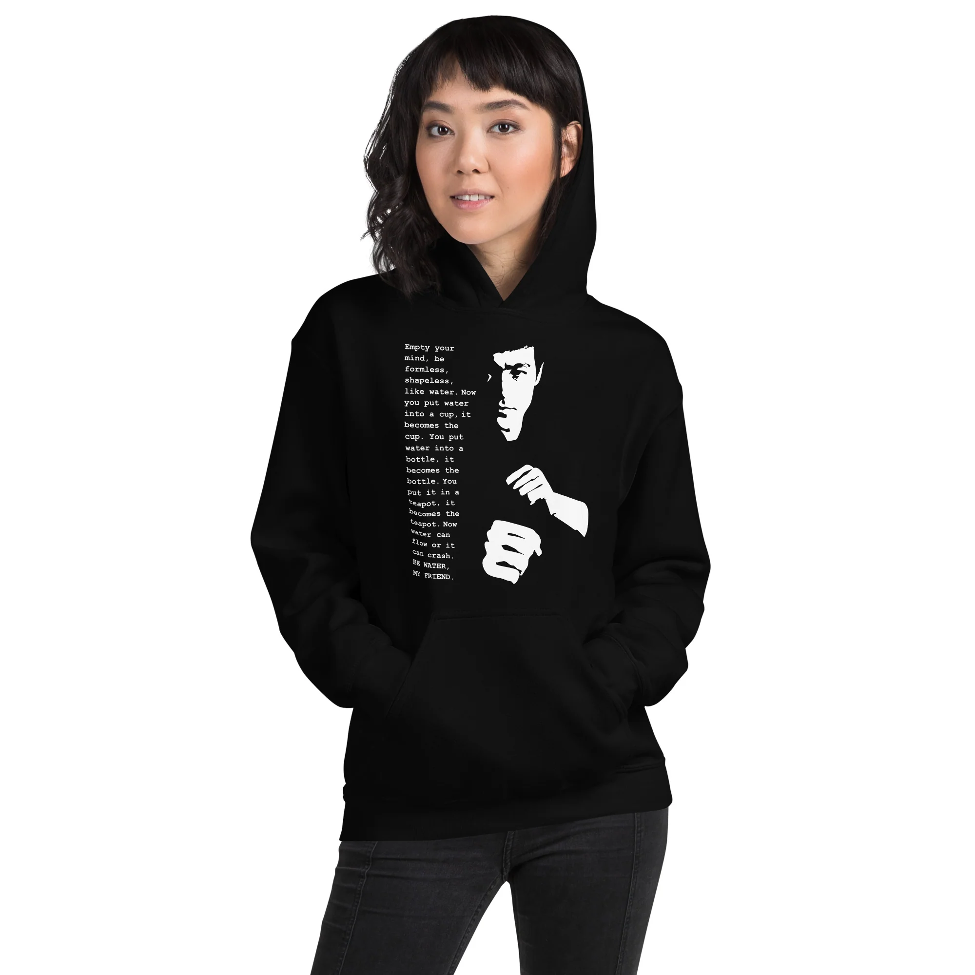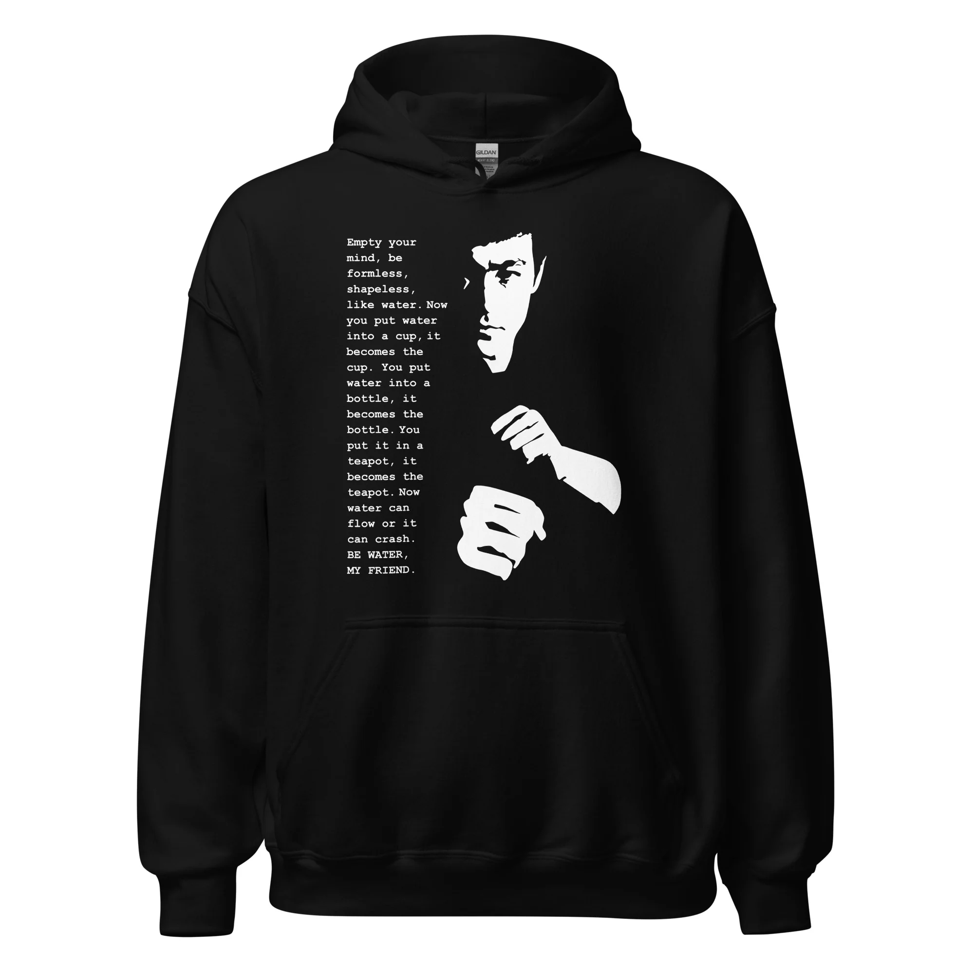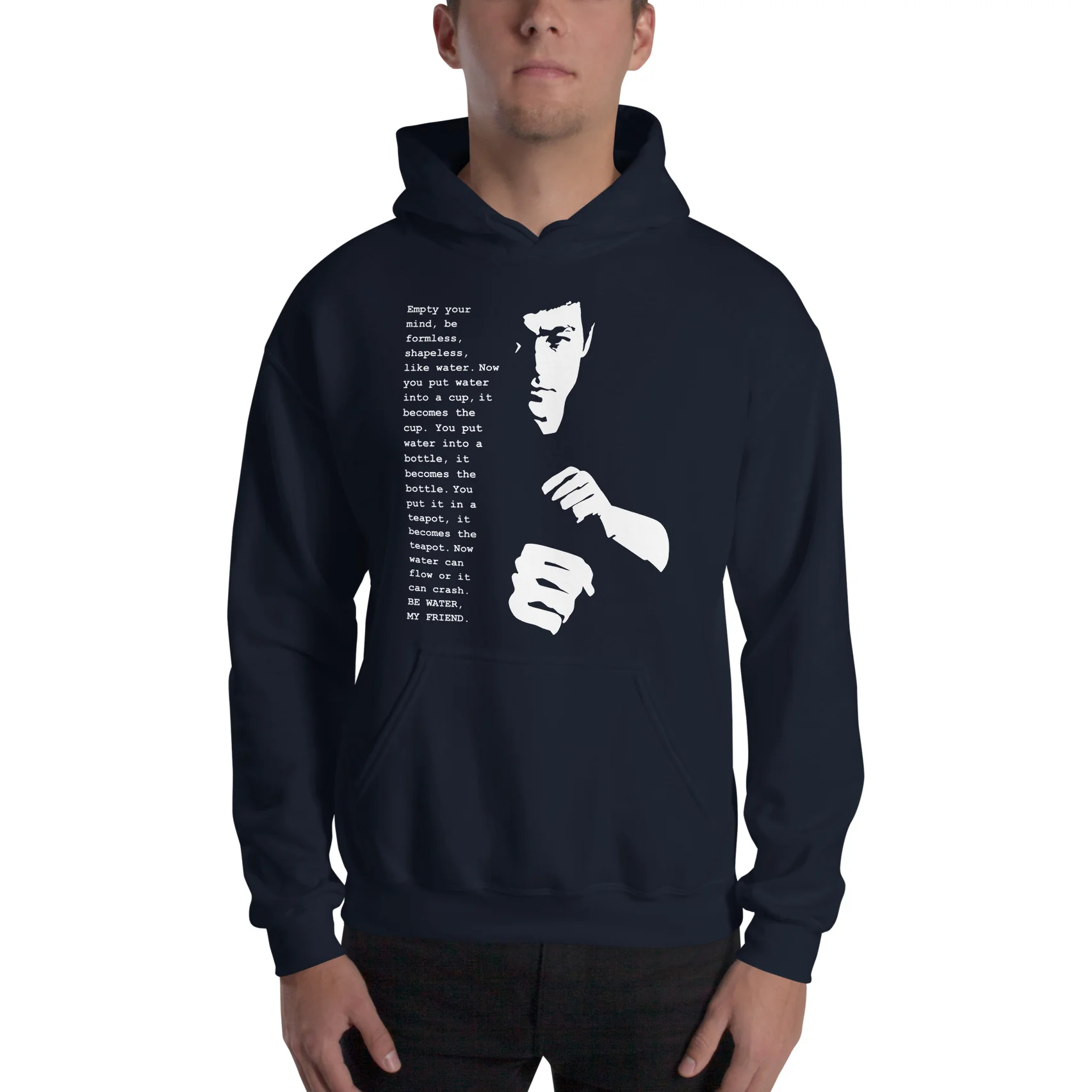 Sudadera con capucha de Bruce Lee con su frase Be water, my friend. Se refiere a la capacidad de ser flexible y adaptarse a los cambios en la vida. Esto significa tener paciencia, no tener prejuicios y estar abierto a nuevas ideas. También significa tener la confianza para probar cosas nuevas y no estar demasiado anclado en un enfoque o perspectiva.