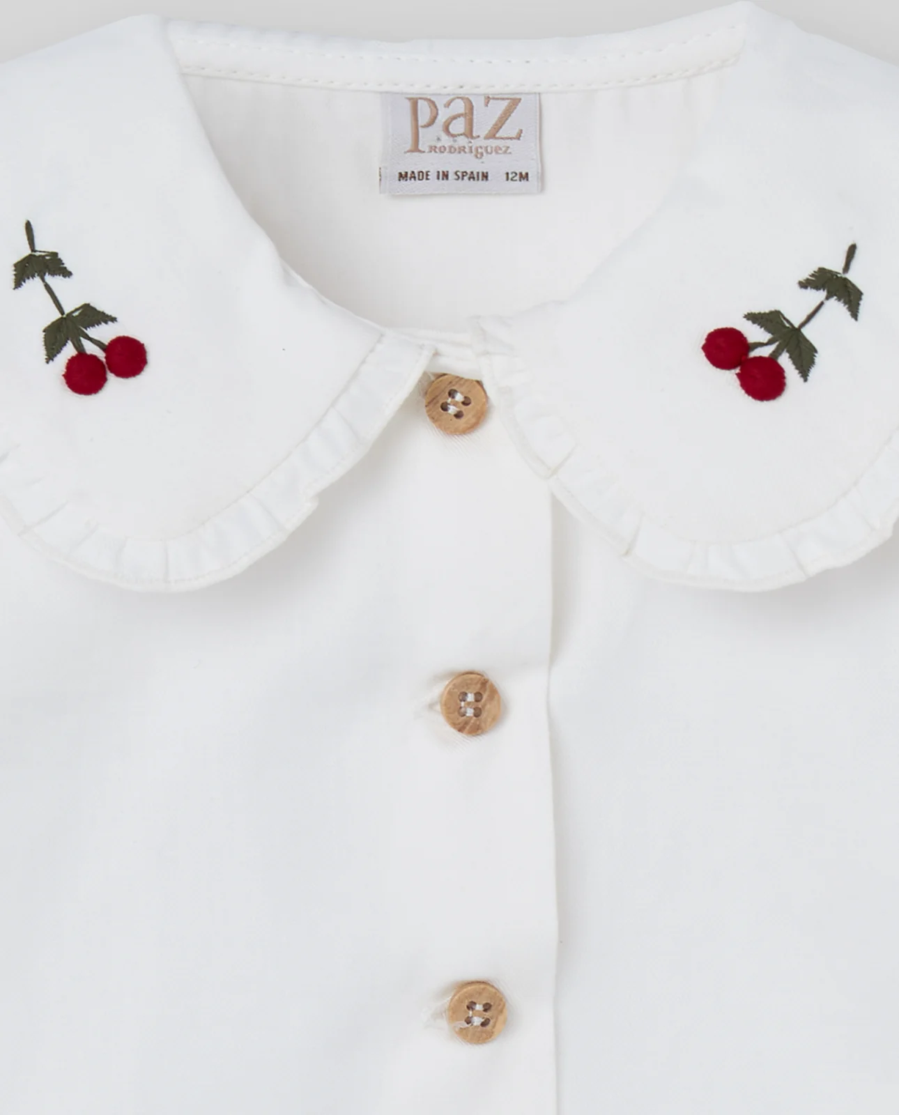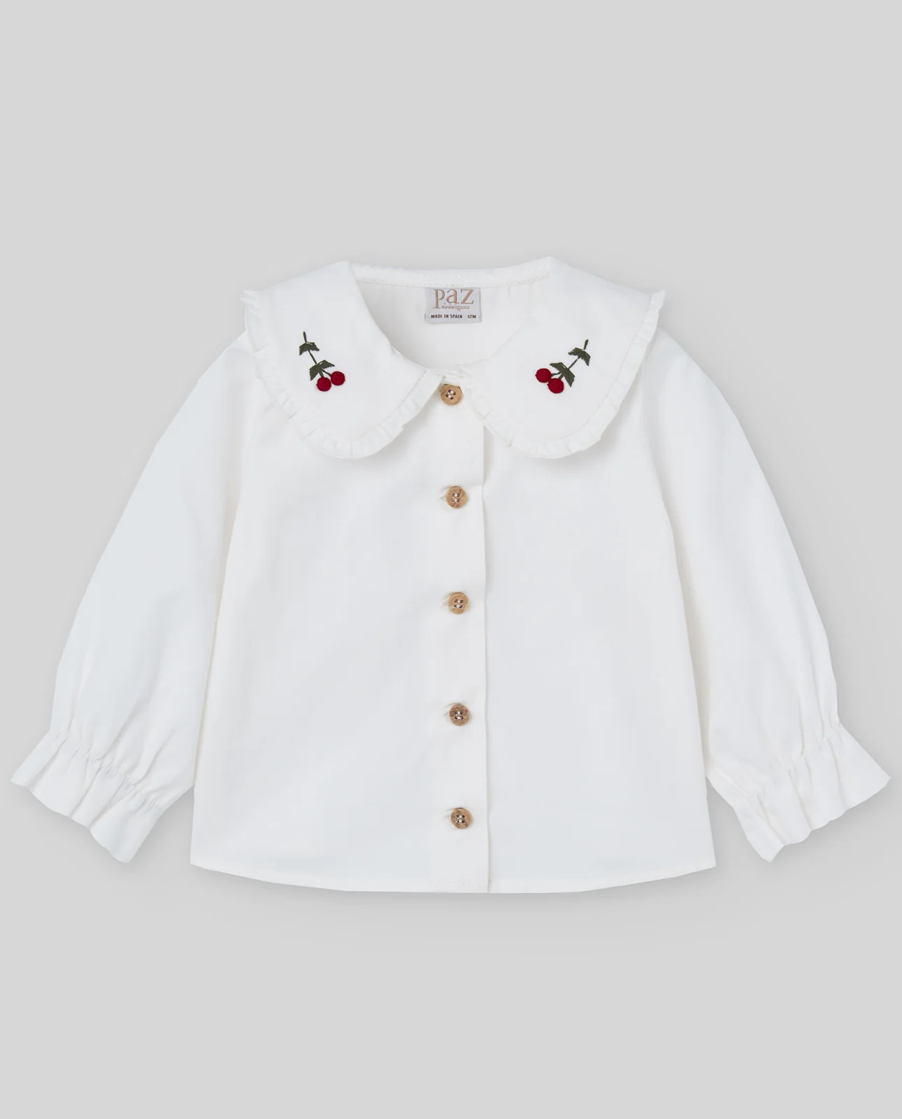 Blusa de niña con bordado floral en el delantero. Cuello redondo con volante fruncido, manga larga con puños elásticos y cierre trasero con botones. Tejido suave y diseño romántico para la colección ACEBO.