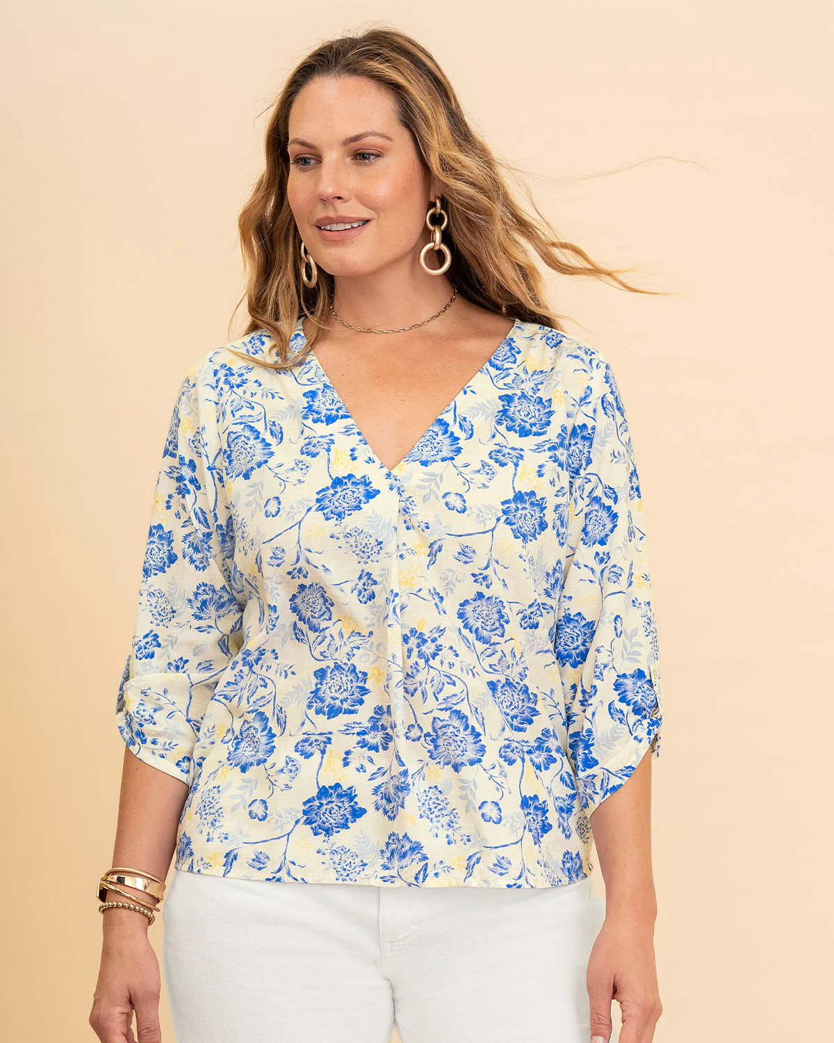 Esta blusa siempre te sacará de apuros. Cuenta con mangas 3/4, cuello en V y charretera en puño no funcional. Puedes usarla con nuestros jeans o pantalones y ser tu versión favorita.