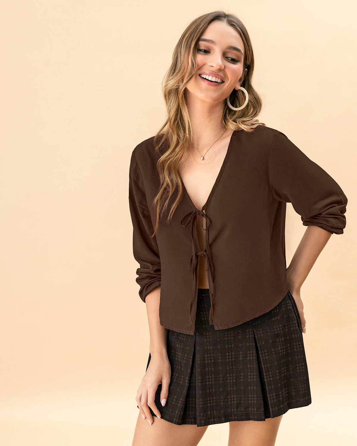 Esta blusa manga larga con tiras anudables en frente es la adición perfecta a tu fondo de armario. Es una prenda sofisticada y versátil que puede servirte para diferentes ocasiones. ¡Úsala amarrada o sin amarrar y crea looks infinitos y llenos de estilo!