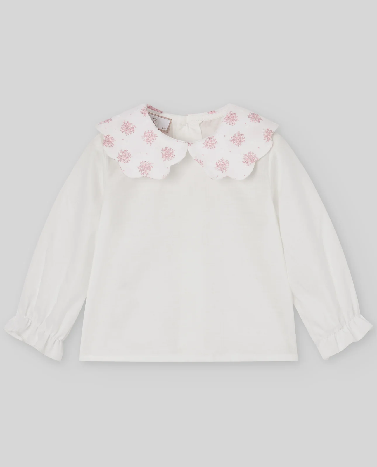 Blusa para niña en lino con cuello estampado floral de forma redondeada. El contraste del cuello con la base lisa añade dulzura y elegancia al conjunto.