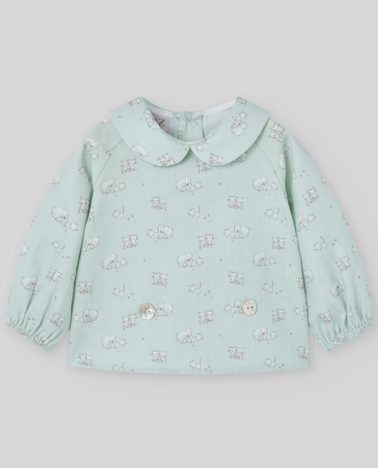 Blusa de niño con estampado de gatitos de la colección MININO. Cuello redondo, manga larga y puños con elástico. Cierre trasero con botones. Una prenda divertida y cómoda para la temporada.