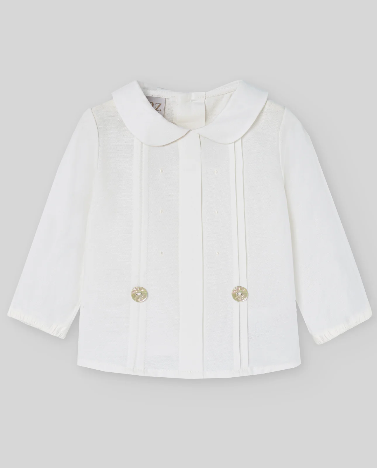 Blusa de niño en tejido liso con cuello camisero. Cierre frontal con botones de madera y manga larga con puños. Corte recto y acabado limpio. Una prenda básica y versátil para looks coordinados de la colección PAZ OI 25-26.