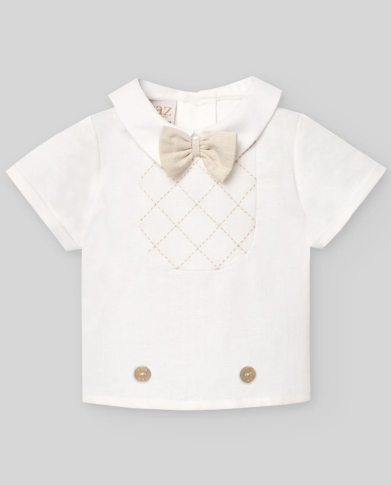 Camisa de manga corta con cuello pico y pechero bordado con motivos geométricos. Incluye parajita atacada en escote delantero.