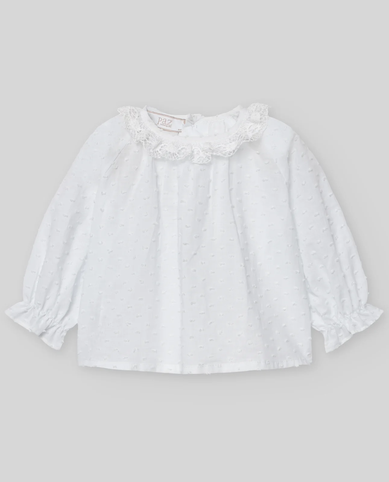 Blusa plumeti para niña con cuello y puños fruncidos. Su textura delicada y diseño romántico la convierten en una opción ideal para ocasiones especiales.