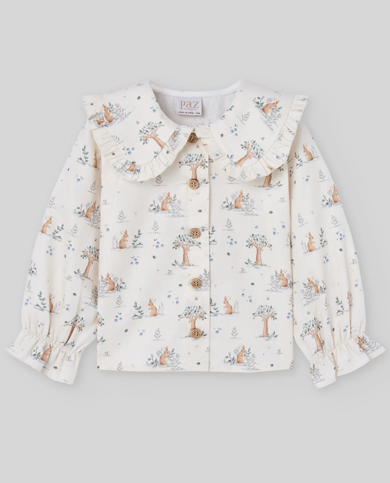 Blusa de niña con estampado de animalitos en tonos pastel. Cuello redondo con volante fruncido, manga larga con puños elásticos y cierre trasero con botones. Diseño lúdico y encantador de la colección POMPON.