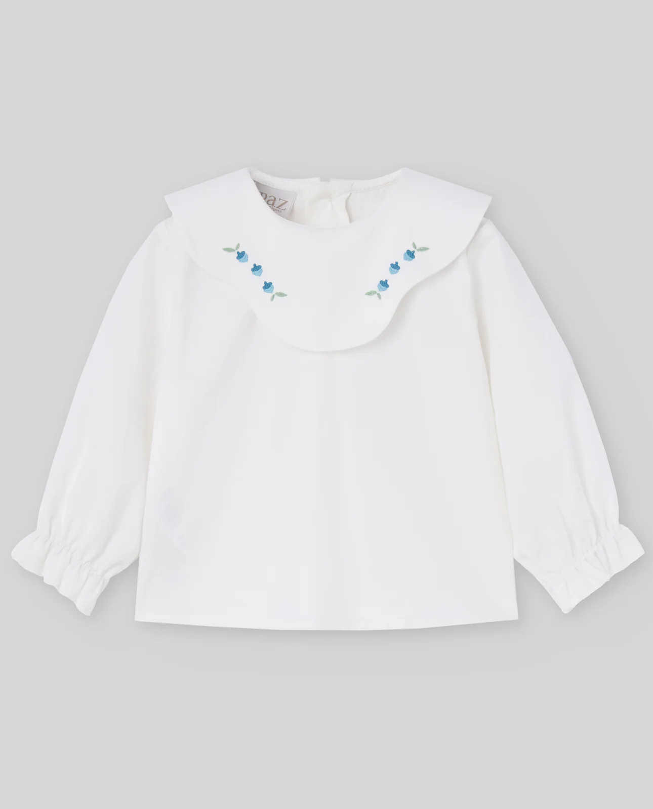 Blusa de niña con bordado floral decorativo. Cuello redondo, manga larga y puños fruncidos. Cierre trasero con botones. Una prenda especial y dulce de la colección QUINTA.
