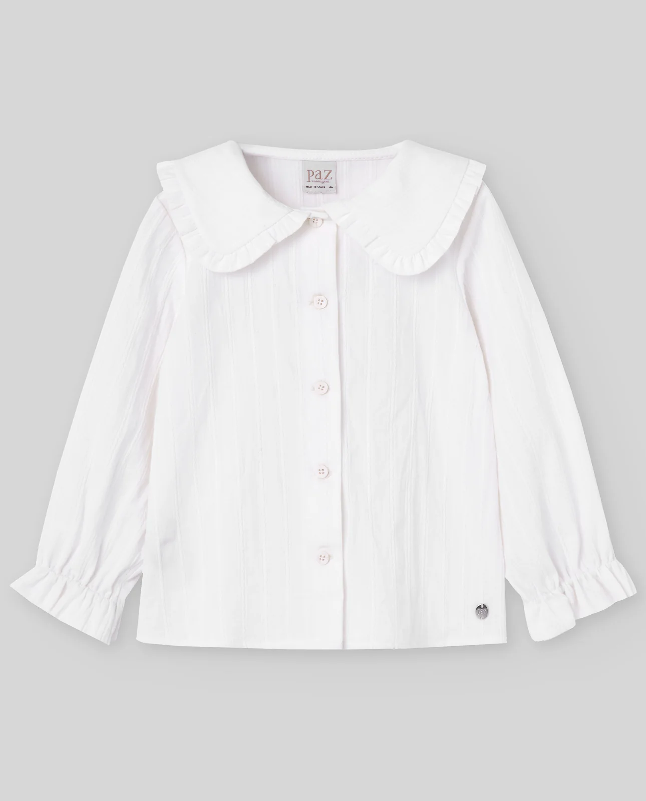Blusa infantil de niña en tejido liso. Cuello redondo con volante, manga larga y puños elásticos. Cierre trasero con botones. Un diseño sencillo y atemporal de la colección SETITAS.