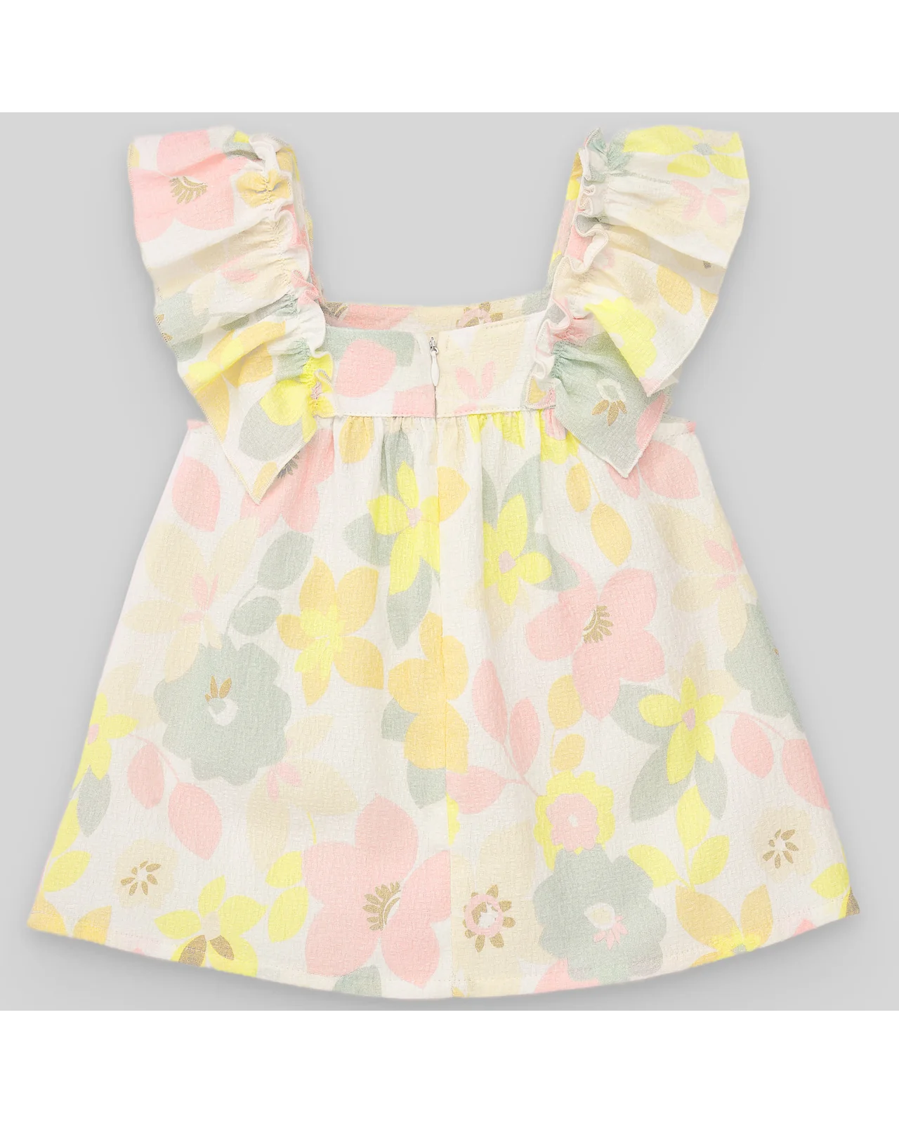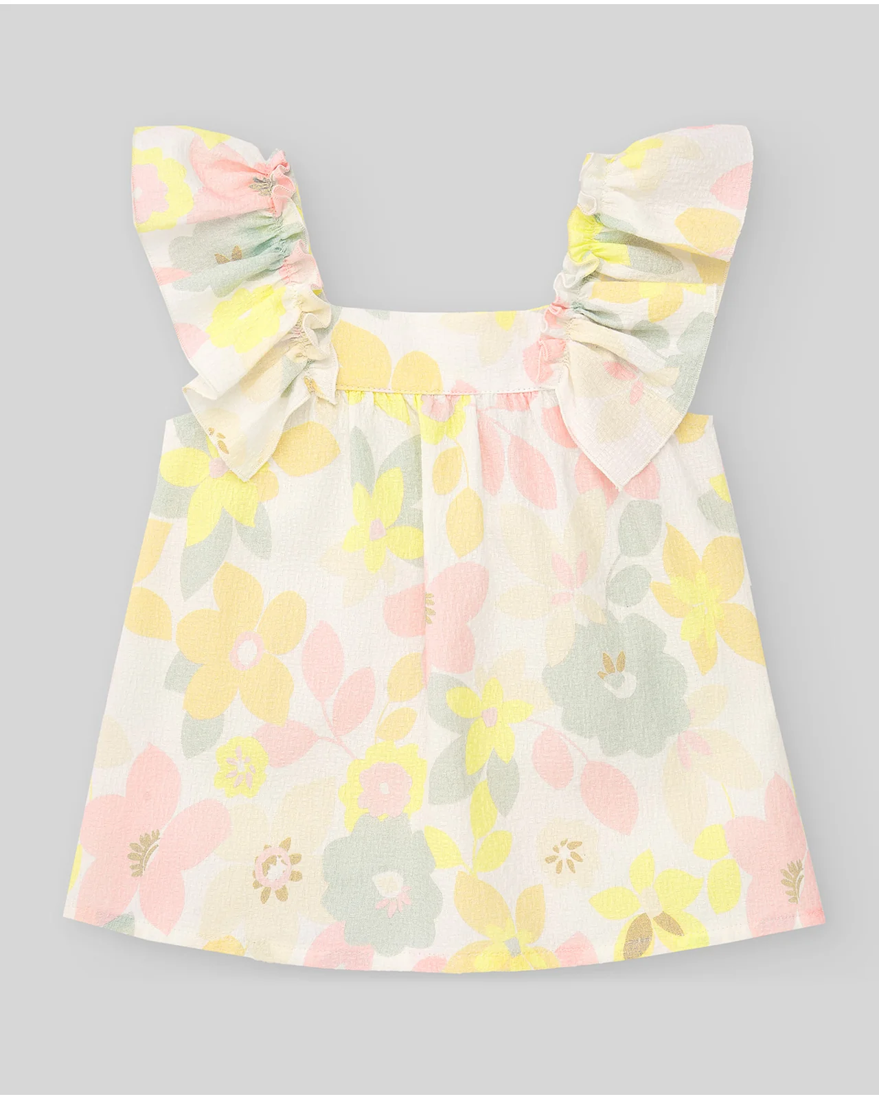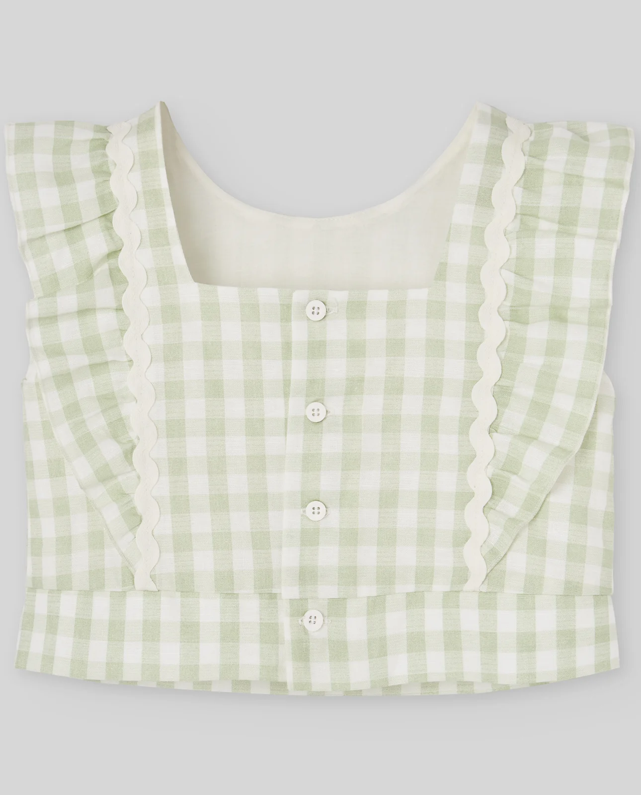 Top para niña con cuello recto y sin mangas acabado volantes. Cremallera oculta en espalda.