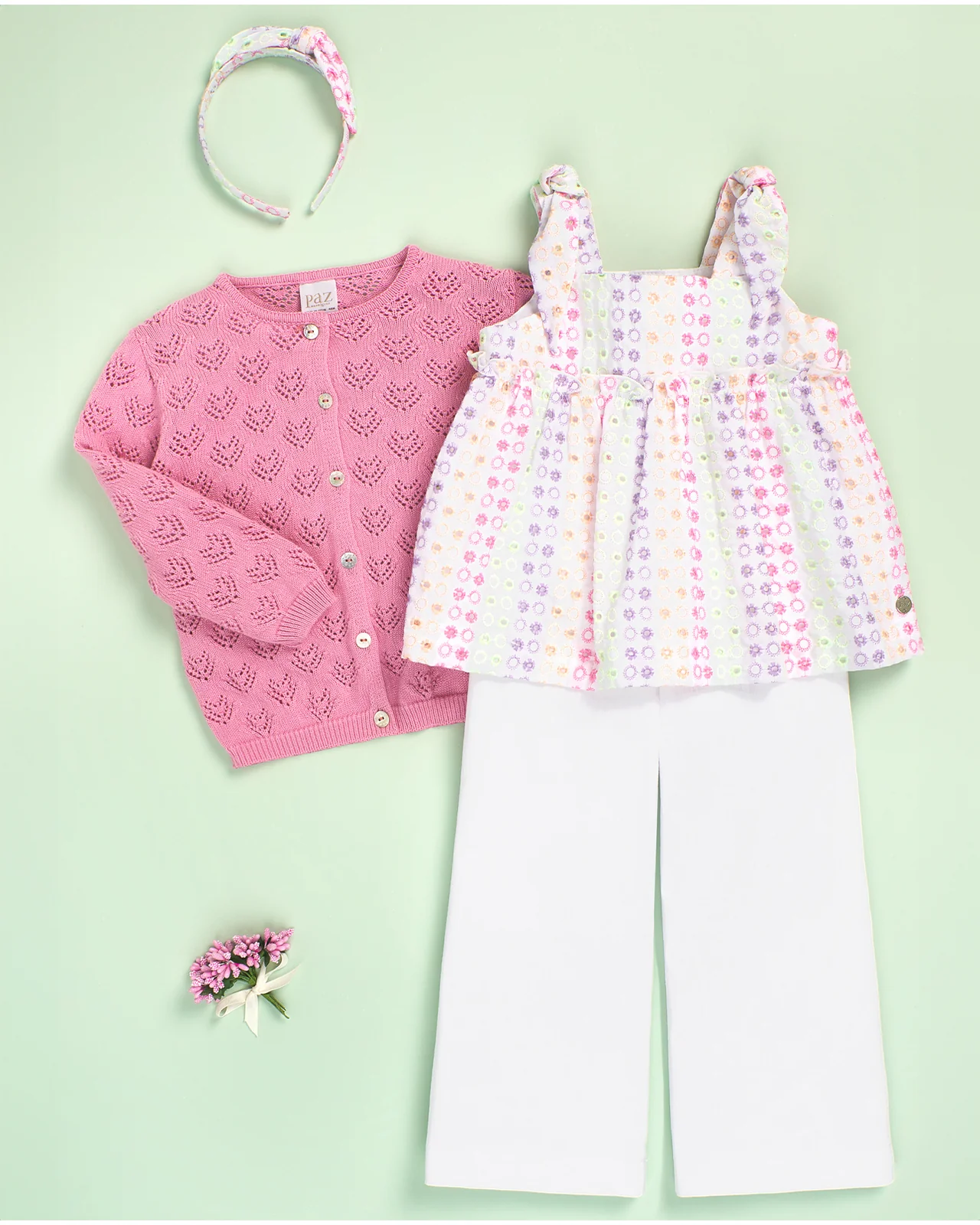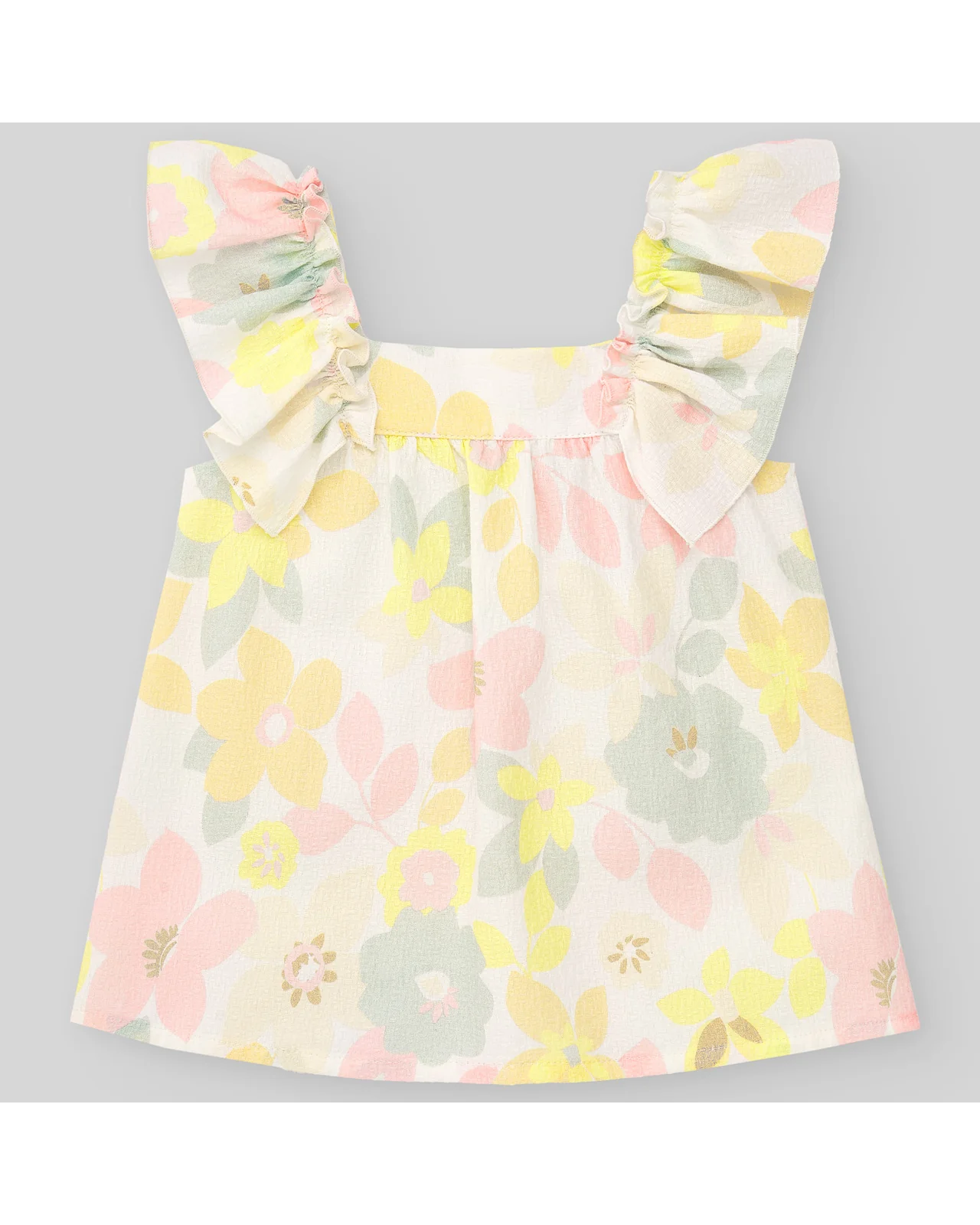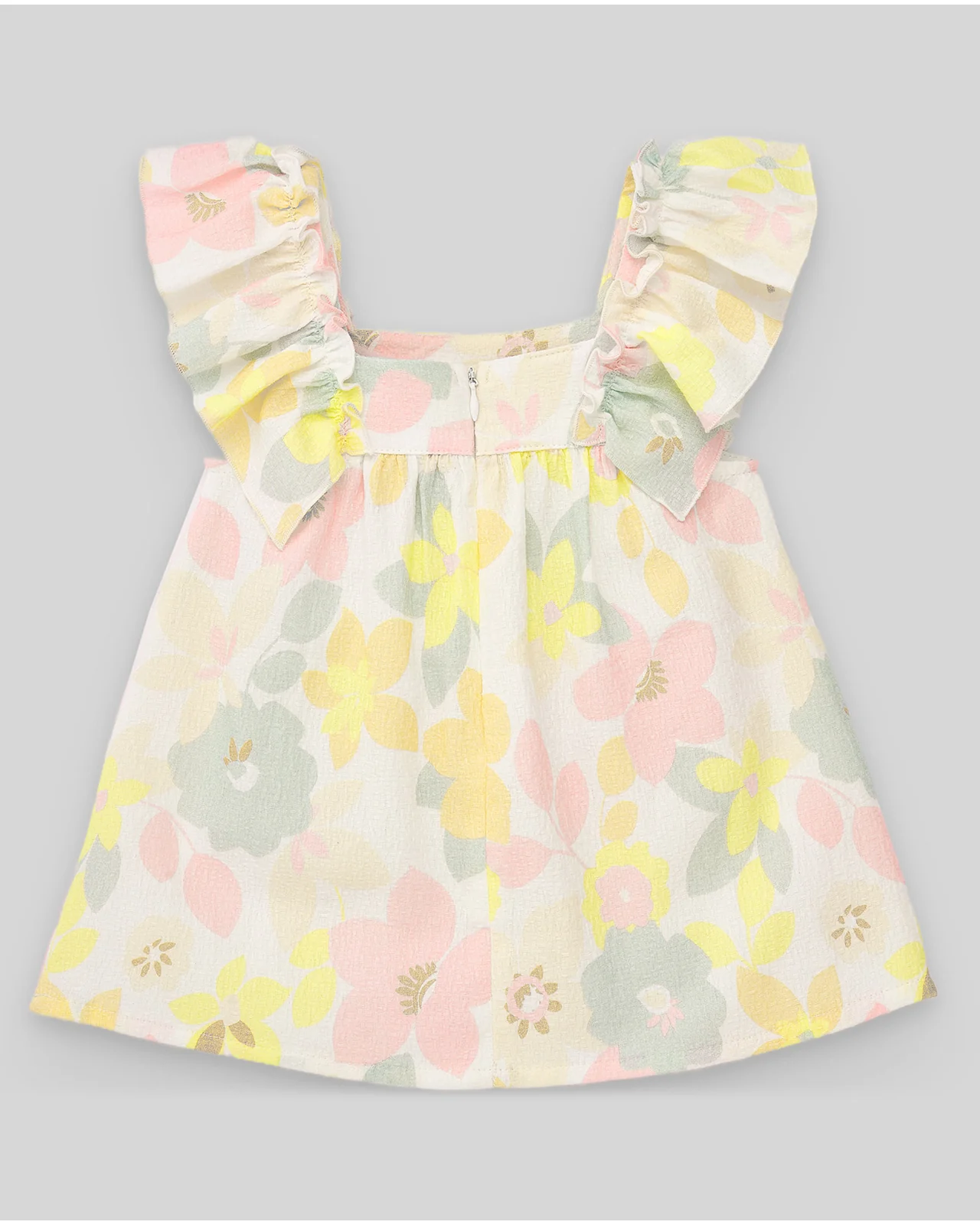Top para niña con cuello recto y sin mangas acabado volantes. Cremallera oculta en espalda.