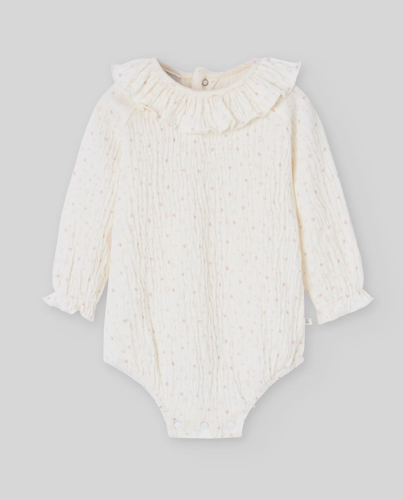 Body de muselina de algodón con estampado de pequeñas estrellas rosas. Cuello con volante fruncido y cierre trasero con botón. El diseño abotonado en la entrepierna facilita el cambio de pañal. Ideal para looks delicados y cómodos.