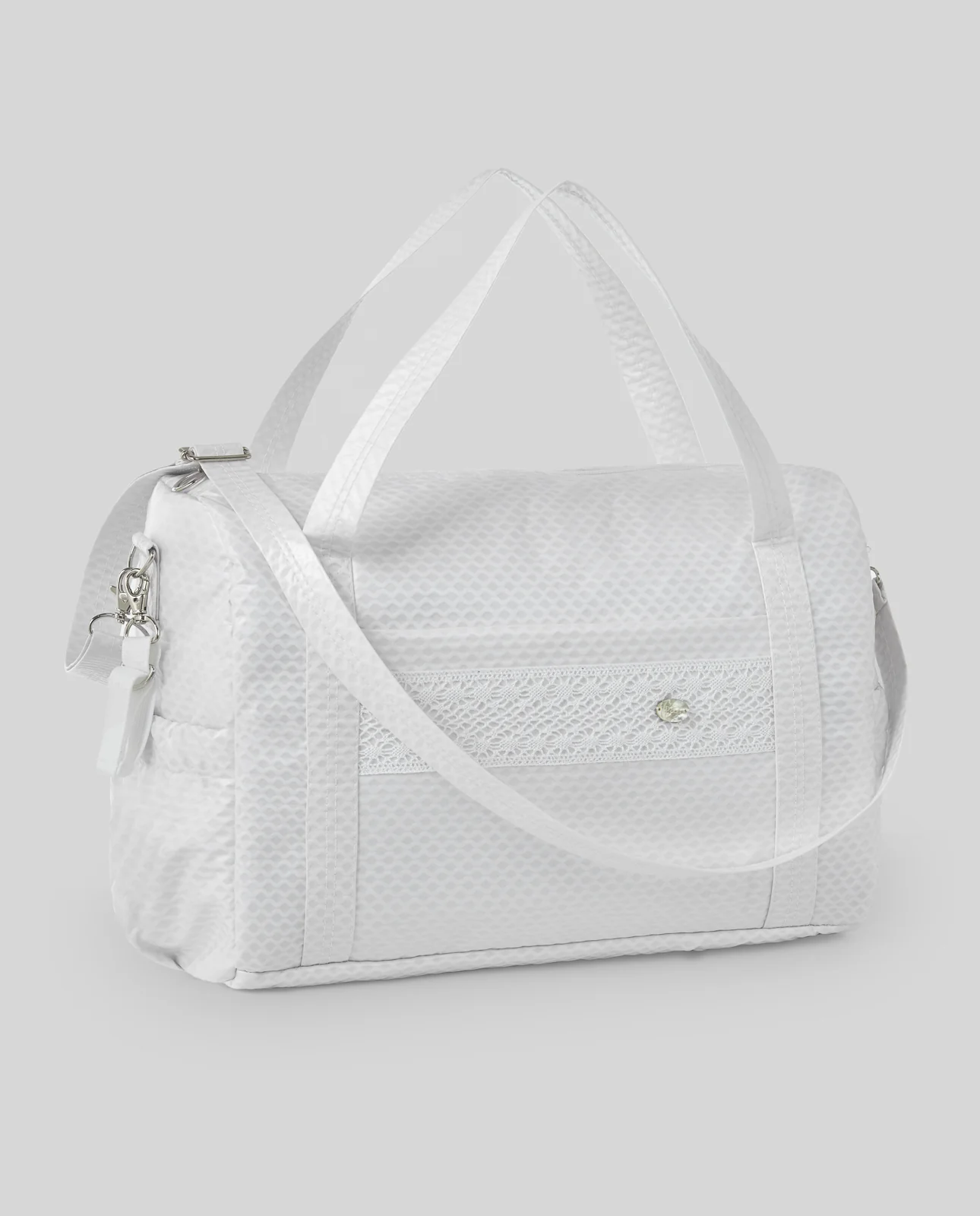 Bolsa de maternidad ideal para llevar todas las cosas del bebé, confeccionada en piqué acabado en vinilo mate con adorno central de entredós ancho. Acolchado hidrofugado interior para facilitar la limpieza.