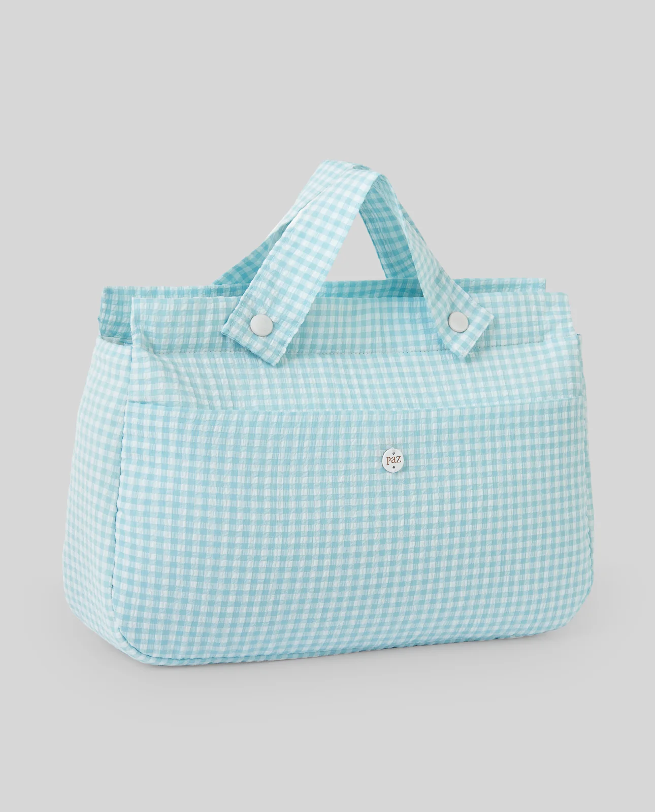 Bolso tipo panera de bambula vichy. Ideal para llevar todo lo necesario para el bebé. Puede colgarse en la silla del bebé. Incluye asa bandolera.