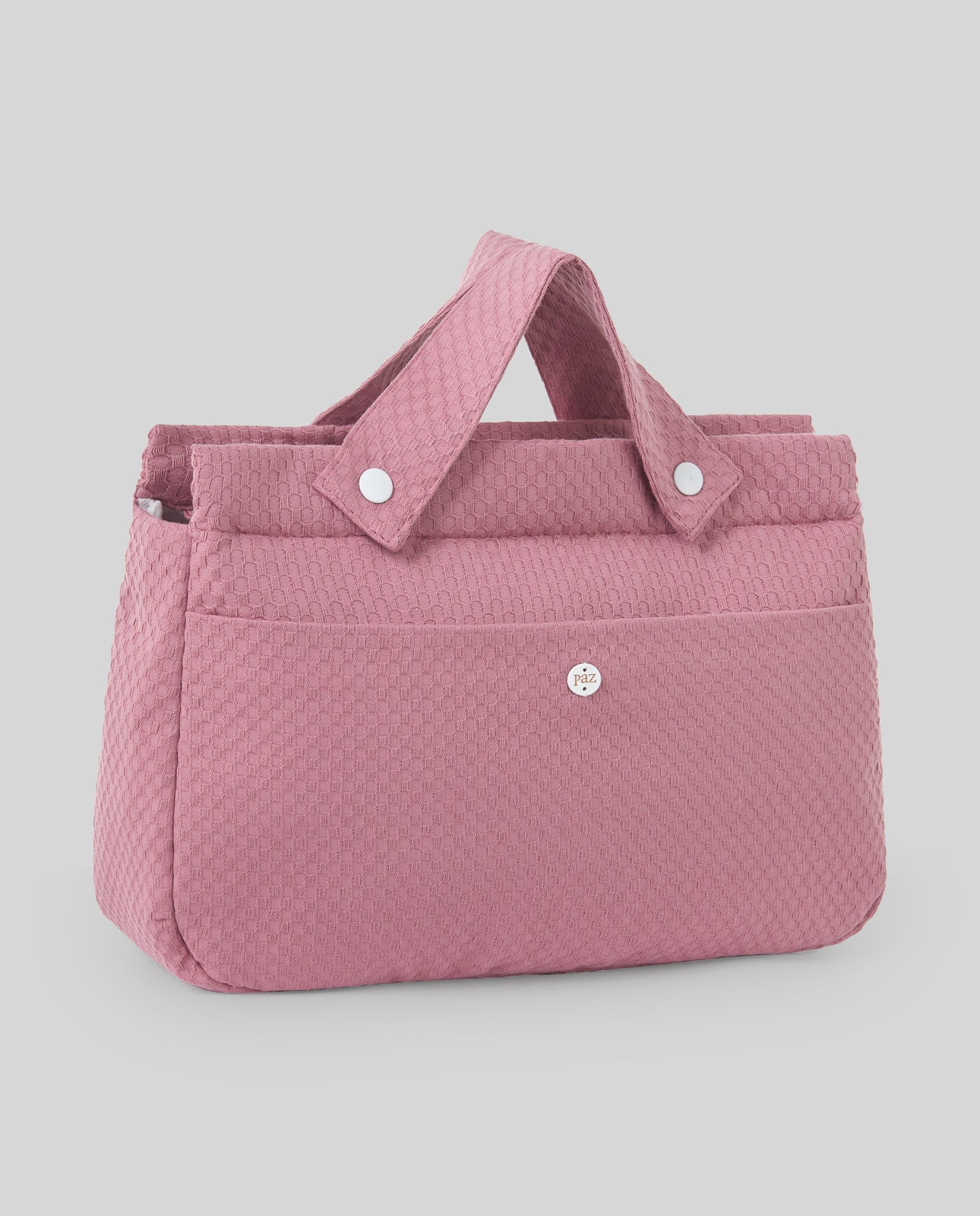 Bolso tipo panera de piqué relieve liso. Ideal para llevar todo lo necesario para el bebé. Puede colgarse en la silla del bebé. Incluye asa bandolera.