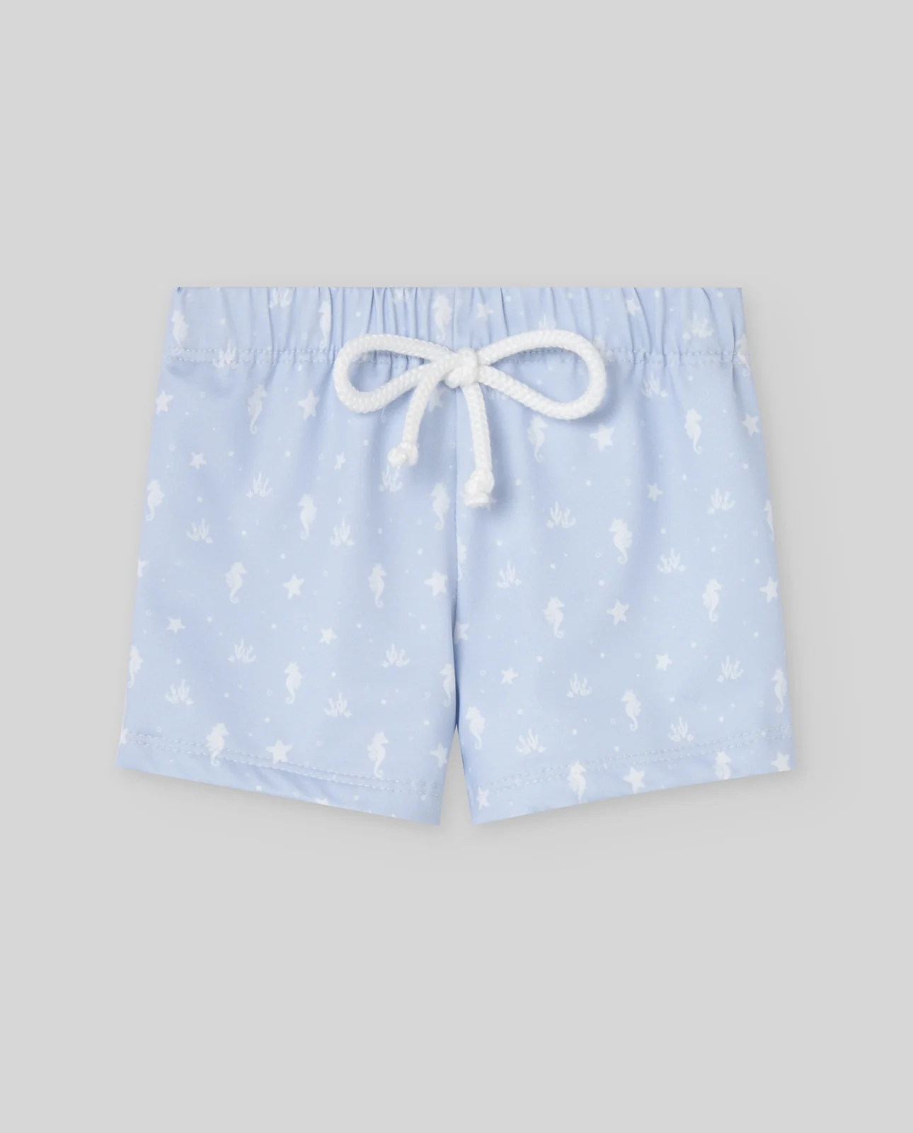 Bóxer de baño para niño de la colección «Baño» con estampado de caballitos de mar. Su tejido de secado rápido y protección solar UPF +50 garantiza confort y protección durante las actividades acuáticas.