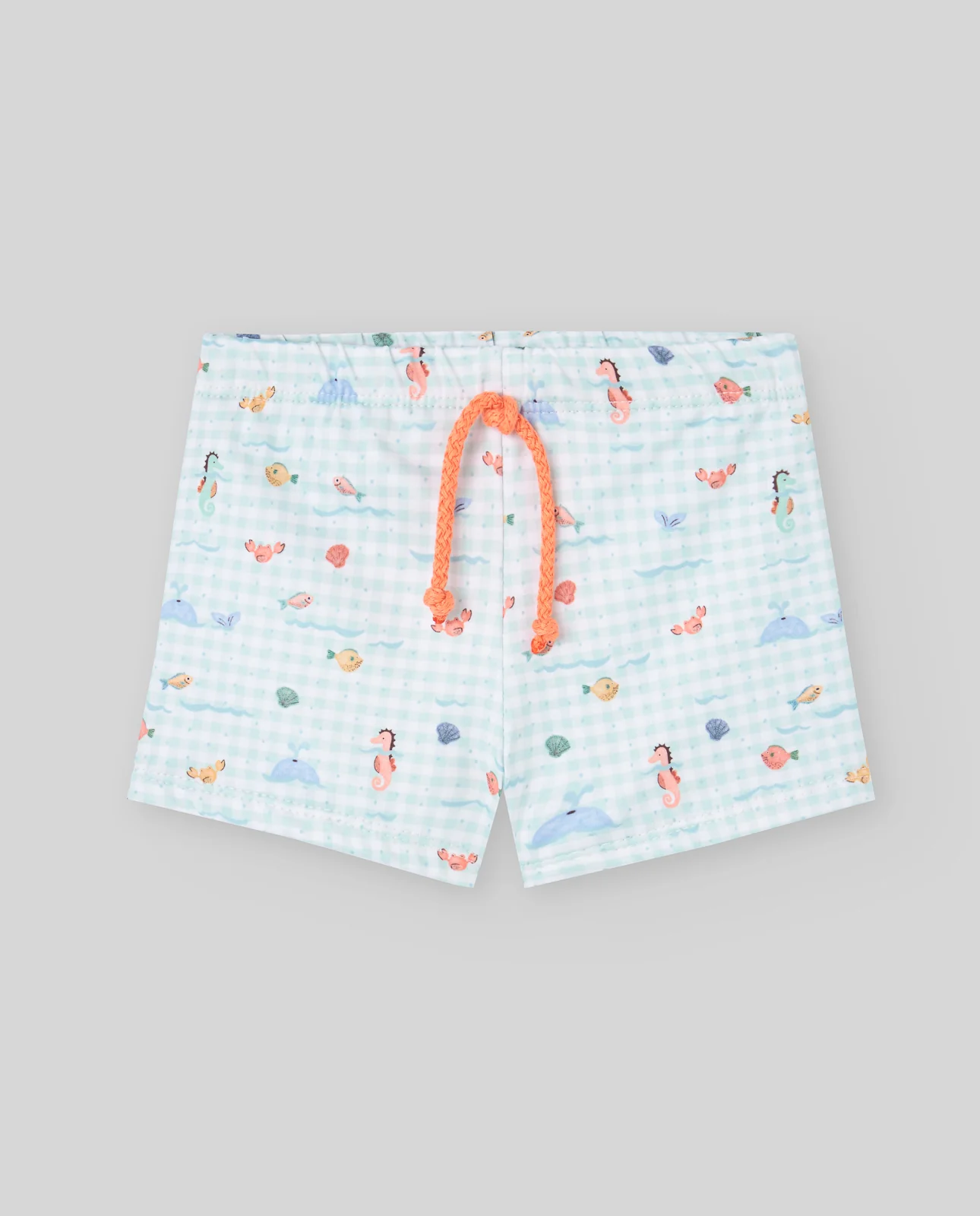 Bañador corto tipo bóxer en tejido elástico estampado con motivo del fondo del mar. Cordón decorativo anudado en el delantero. Tejido con protección solar.