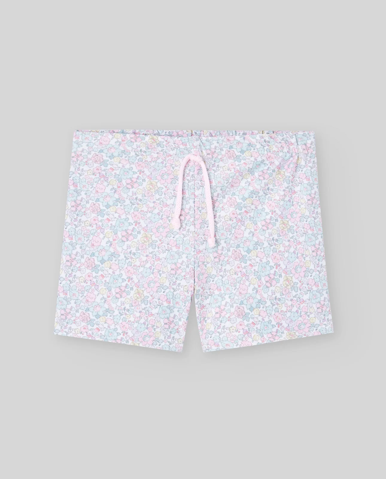 Bañador corto tipo bóxer en tejido elástico estampado con motivo floral. Cordón decorativo anudado en el delantero. Tejido con protección solar.