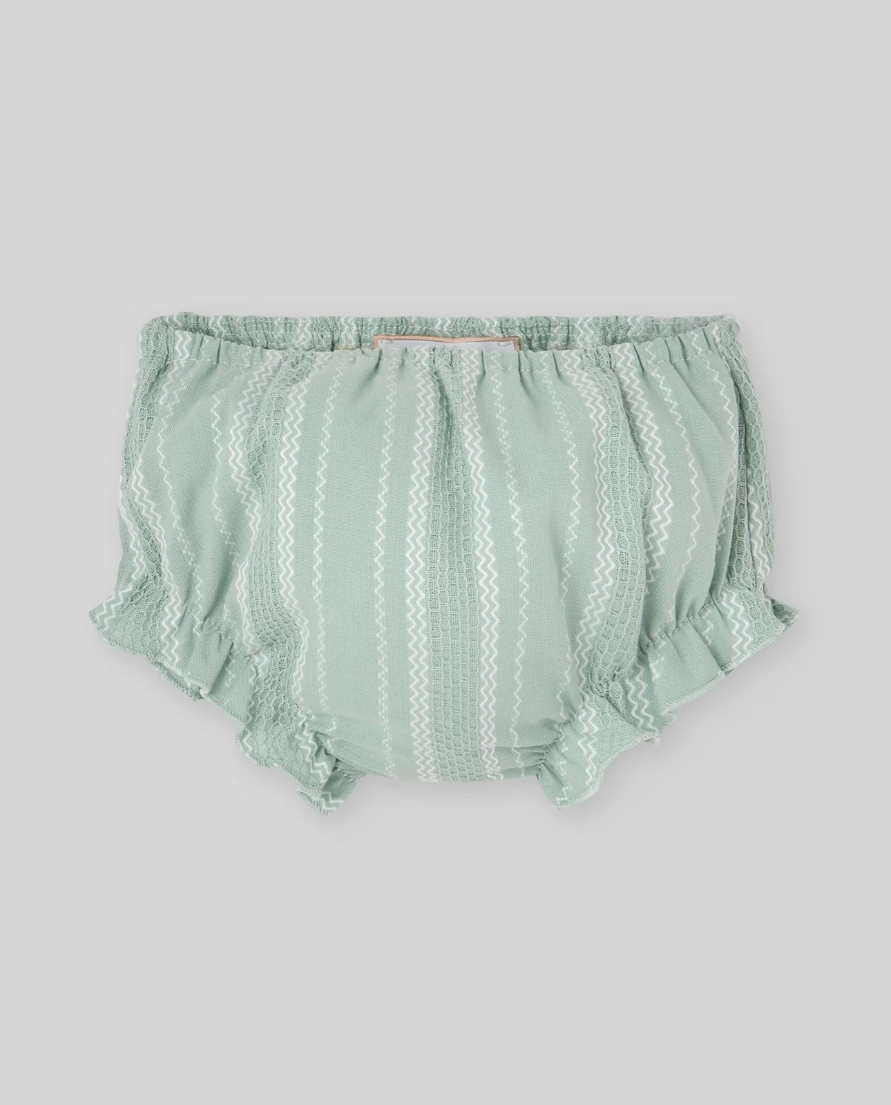 Braga de tela para bebé realizada en un tejido de algodón con un original diseño de rayas y relieves verticales. Su acabado fresco y su textura ligera aportan un aire natural y elegante, ideal para combinar con el jubón y la capota de la colección «Cauce».