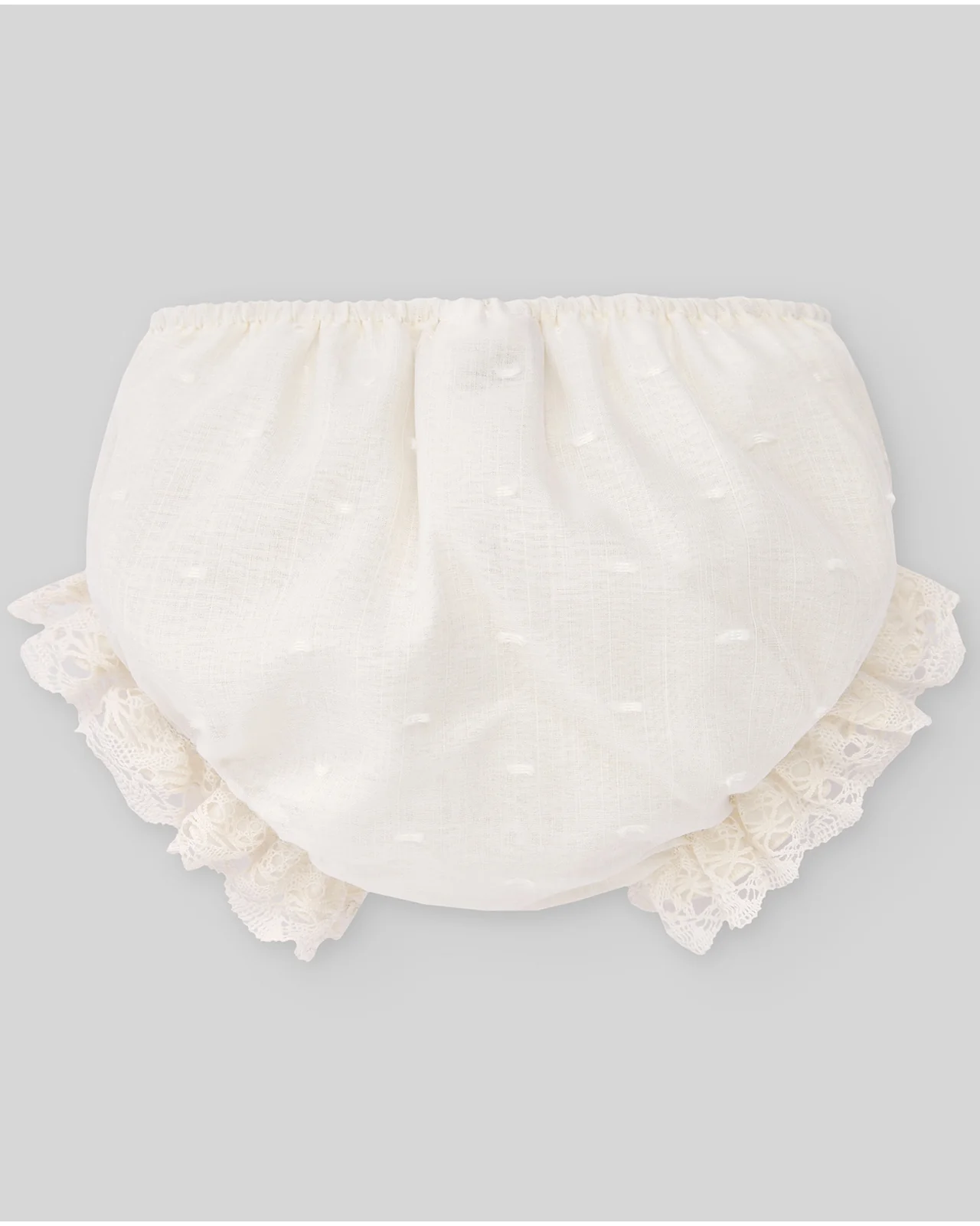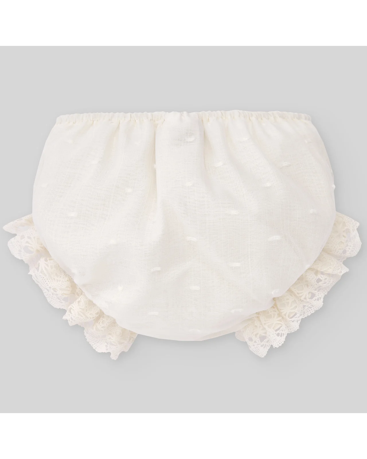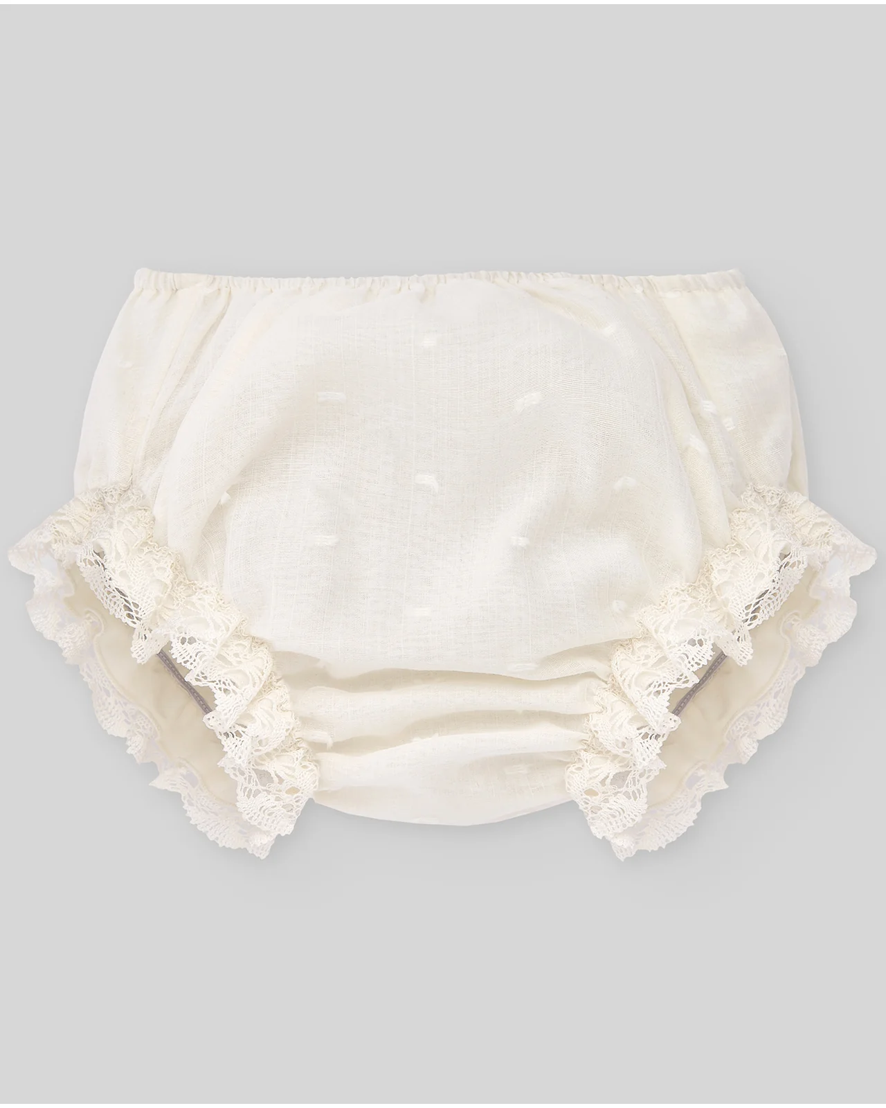 Braga de muselina con detalle de plumeti en contraste que añade textura y elegancia a la prenda. Su cintura fruncida y acabado abullonado le otorgan un aire tradicional ideal para ocasiones especiales o bautizos.