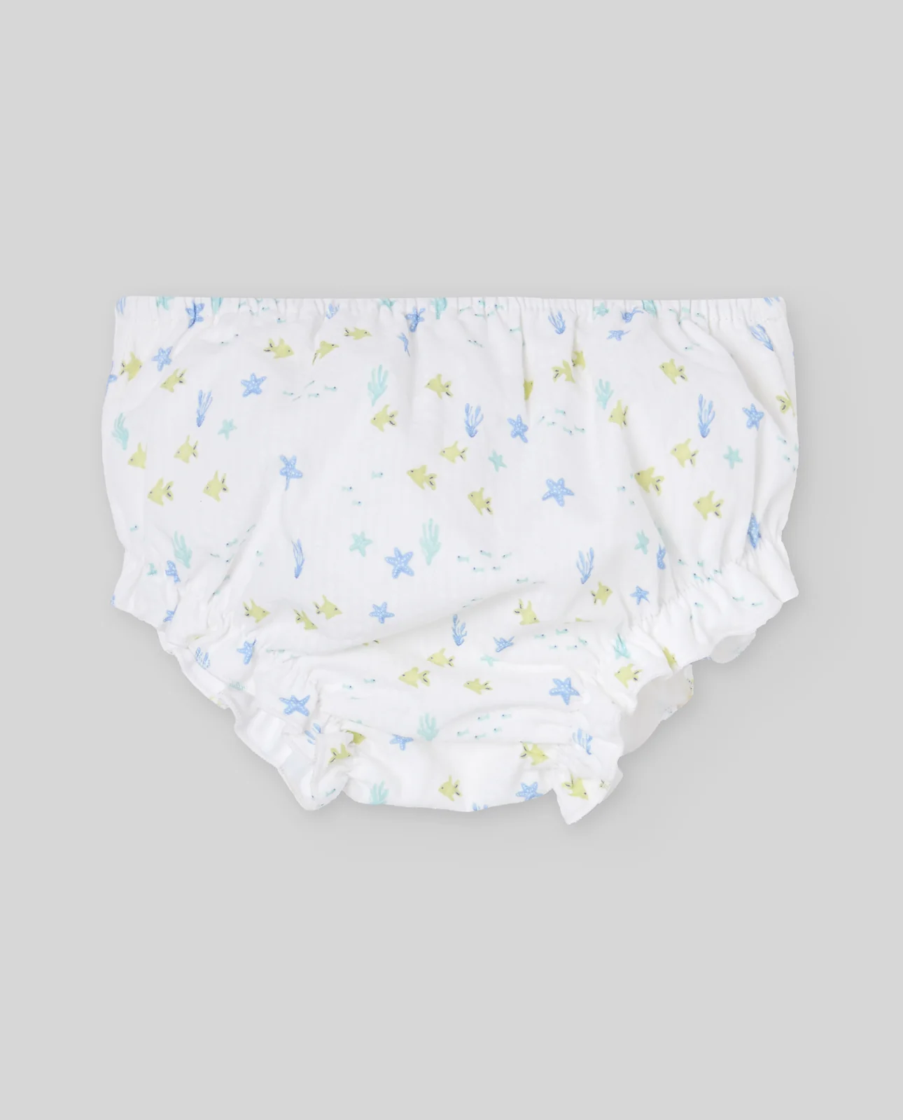 Braga de tela para bebé con estampado marino de pececitos, estrellas y corales en tonos suaves. Confeccionada en algodón fino y fresco, incluye cintura elástica y volantes en las perneras para mayor comodidad. Perfecta para acompañar los conjuntos de la colección «Corales».