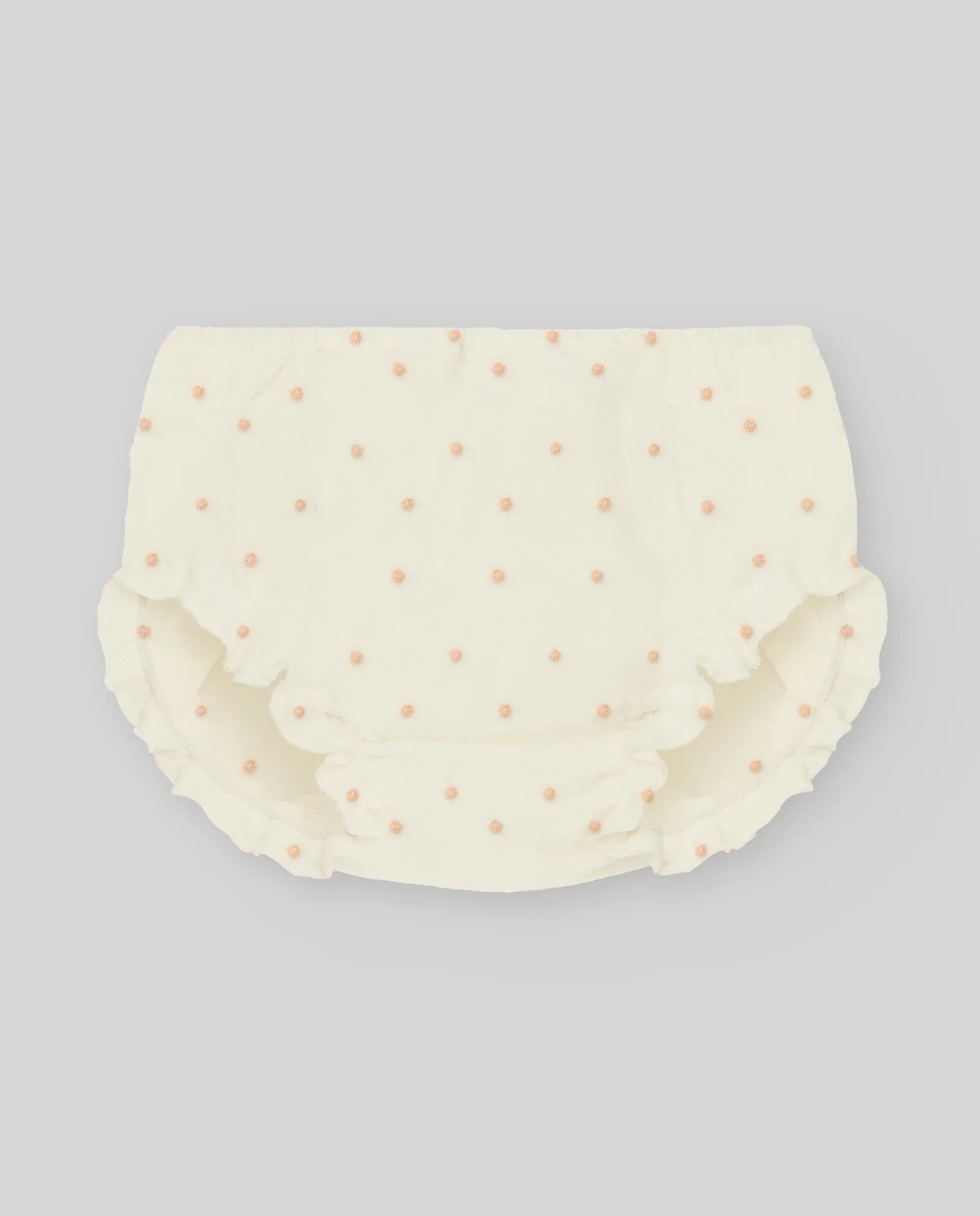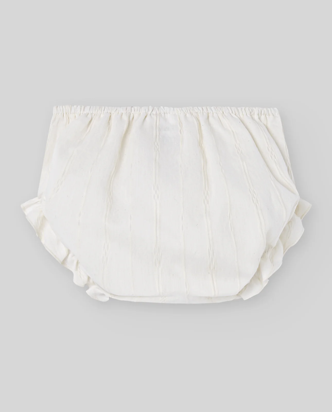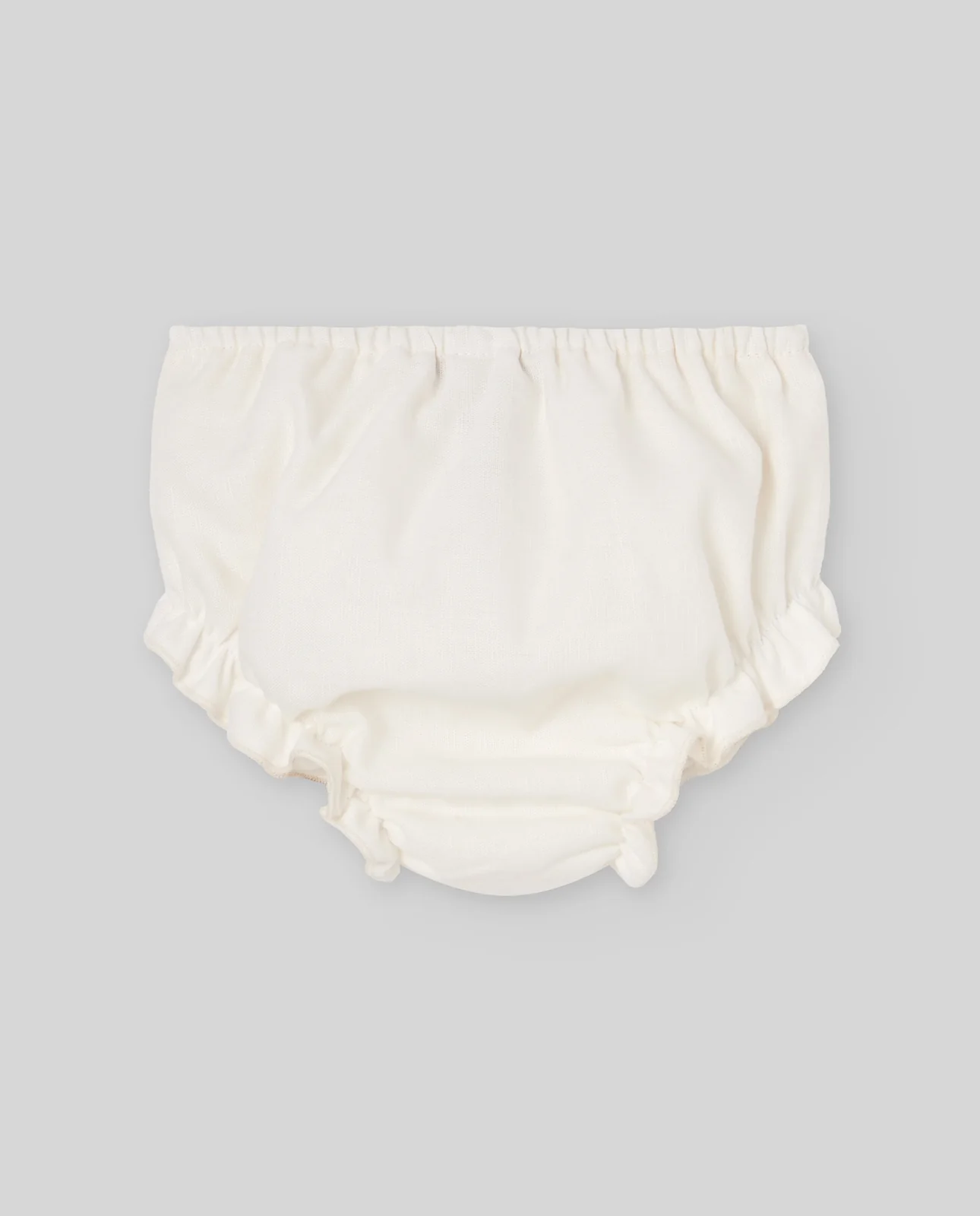 Braga de tela para bebé con delicado estampado de caracolas azules sobre fondo blanco, elaborada en plumeti de algodón. Su tejido ligero y su diseño con cintura elástica y volantes aportan un estilo dulce y veraniego, ideal para la colección «Eden».
