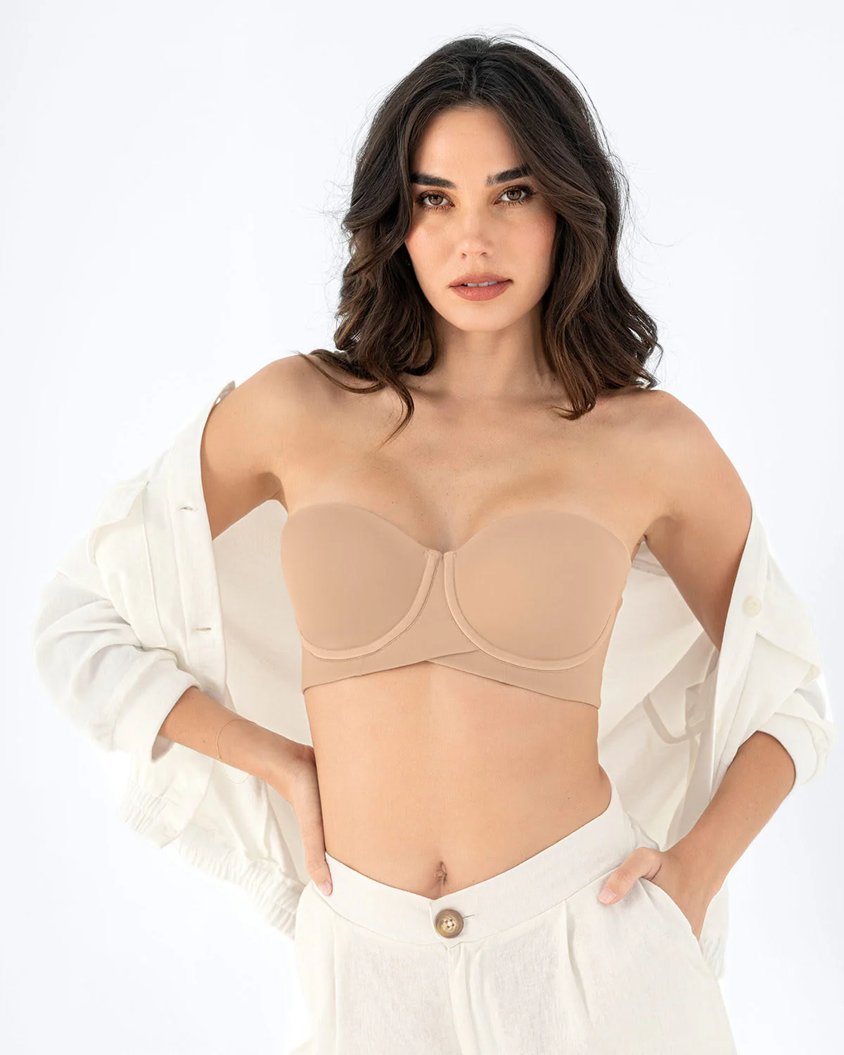 ¡El bra strapless para busto grande y pesado, que no se cae mientras lo usas! y lo mejor ¡sin realce incorporado! Tiene una banda siliconada interna en las copas y en la espalda para darle más ajuste a tu piel. Sus copas son profundas, de muy buena capacidad. Además en la base del busto y en la espalda, cuenta con una capa interna de nuestro material de compresión PowerSlim que le da ajuste extra a tu piel. Lo puedes usar con o sin cargaderas, y puedes ajustarlas a tu contorno. La espalda es elástica, con buena capacidad, y tiene una abrochadura de 3 broches con 4 niveles de ajuste.