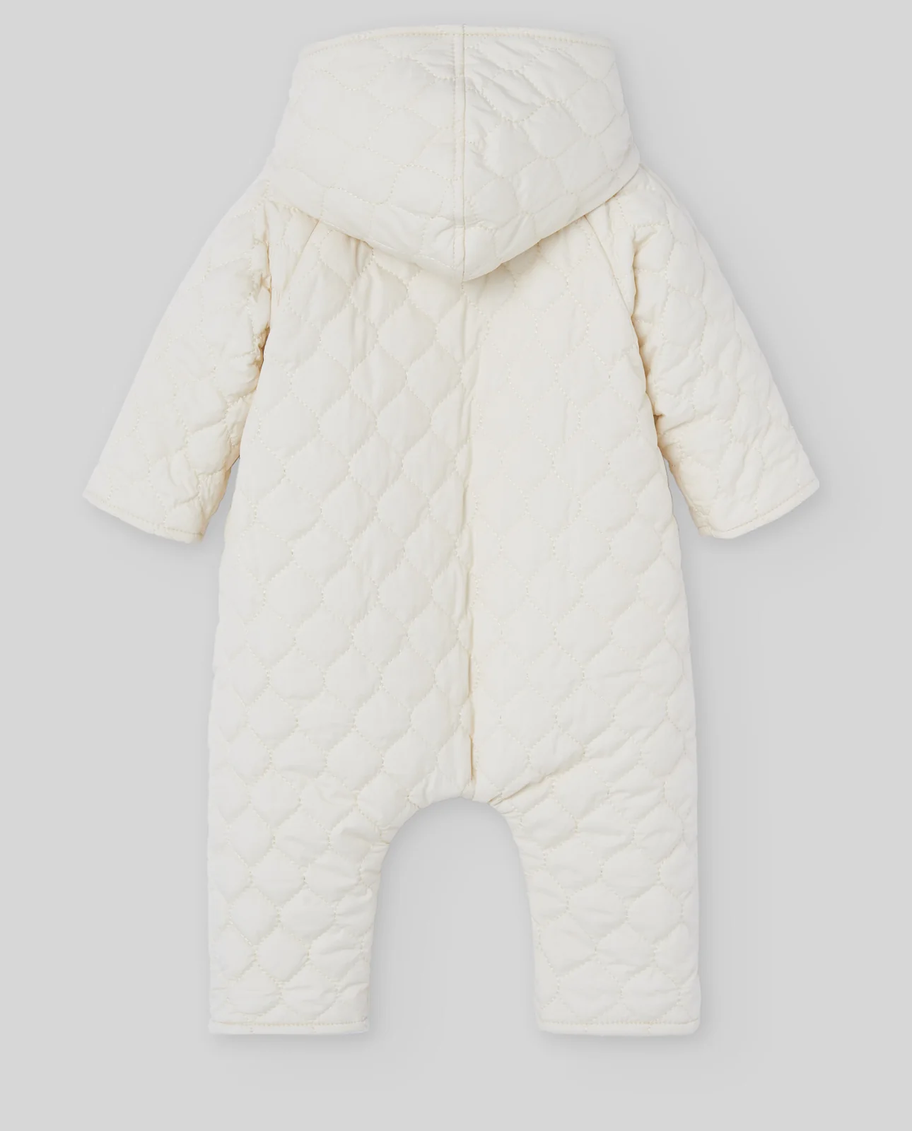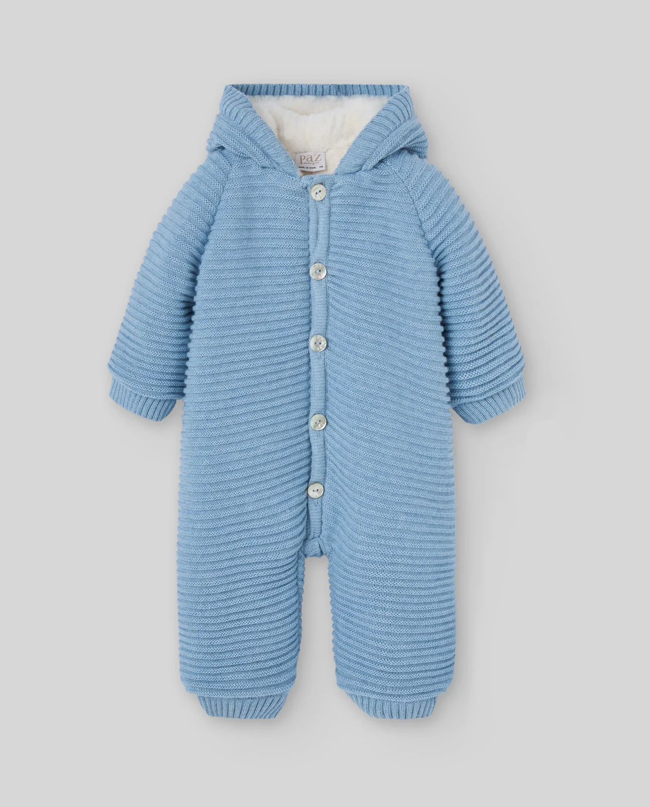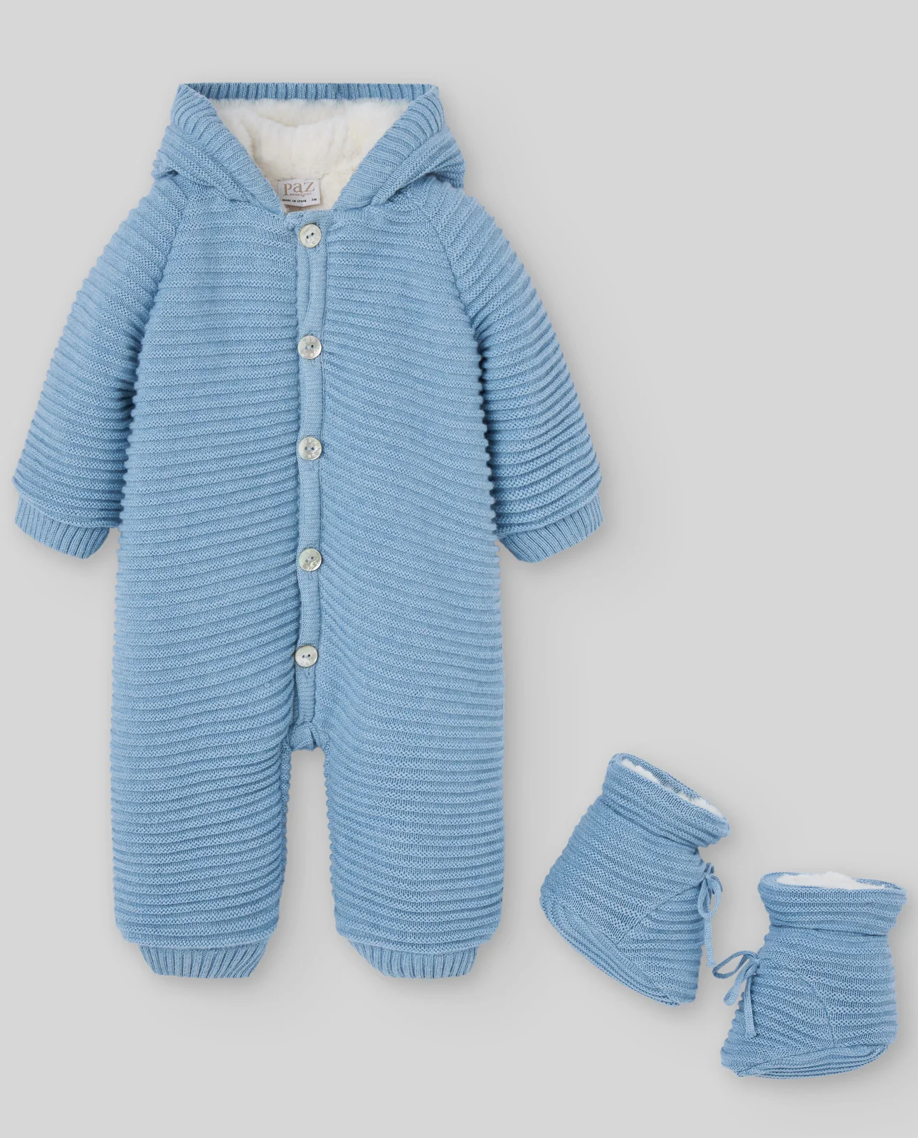 Versión con patucos del clásico buzo de punto. Confeccionado en algodón con cachemir, incluye capucha, cierre frontal con botones y forro interior afelpado. Pensado para ofrecer abrigo total en los días fríos, incluyendo protección para los pies.
