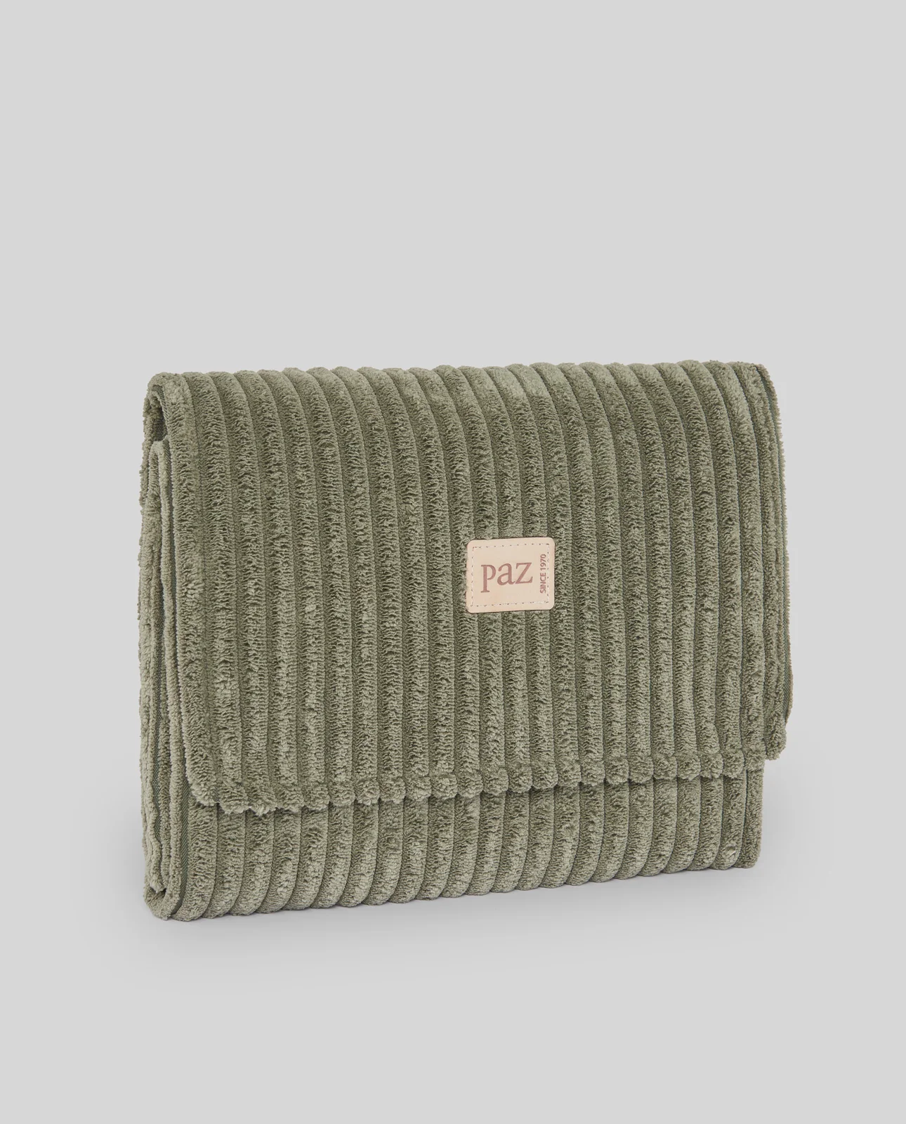 Cambiador plegable acolchado de pana ancha. Interior resistente al agua y fácil de limpiar. Cierre con imán para mayor comodidad.