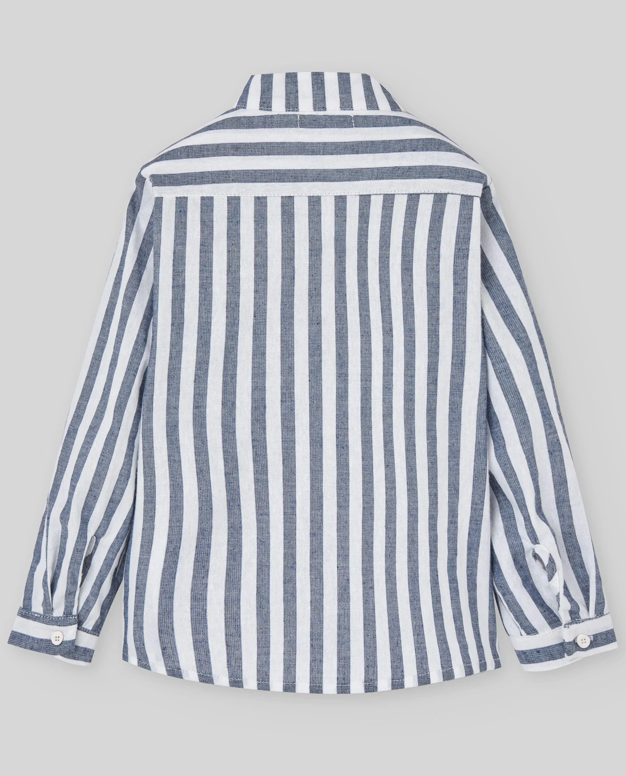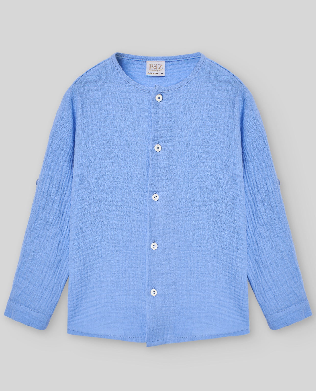 Camisa para niños en tejido bambula de manga larga. Cuello redondo sin solapa y botonadura frontal a contraste. Botones en las mangas para ajuste a manga corta.