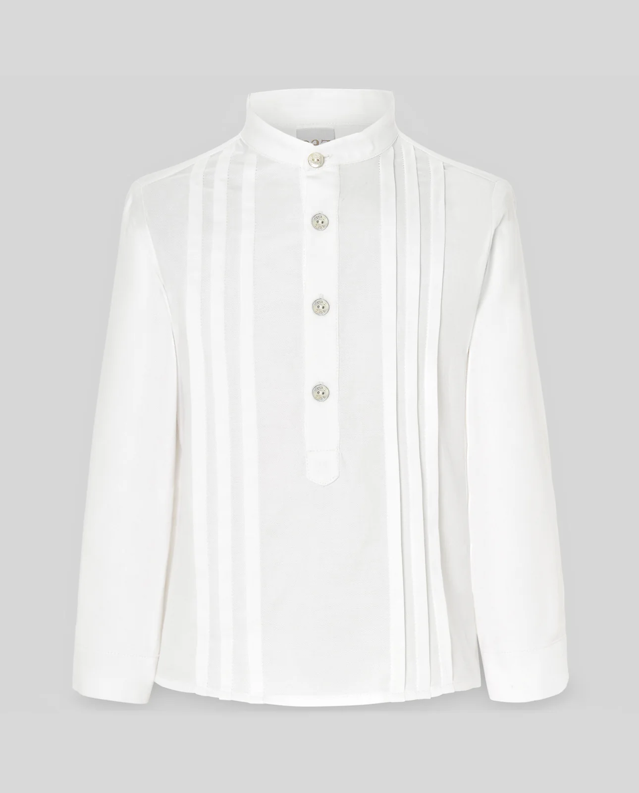 Camisa infantil de lino con cuello mao y botones nácar personalizados con el logo de PAZ Rodríguez.