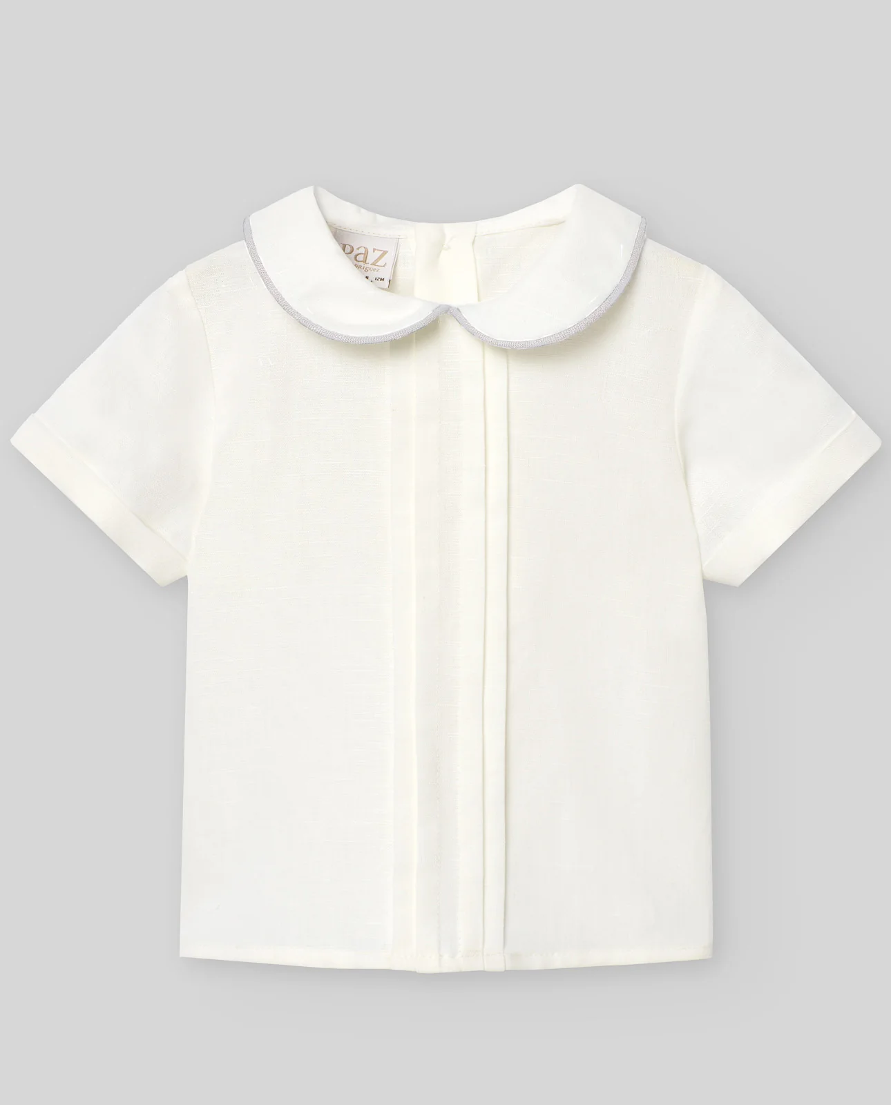 Blusa para bebé niño con cuello bebé. Detalle de lorzas en el delantero y cuello bebé con remate a contraste. De manga corta, es ideal para coordinar con sus looks de ceremonia. Cierre trasero con botones a tono para mayor confort.