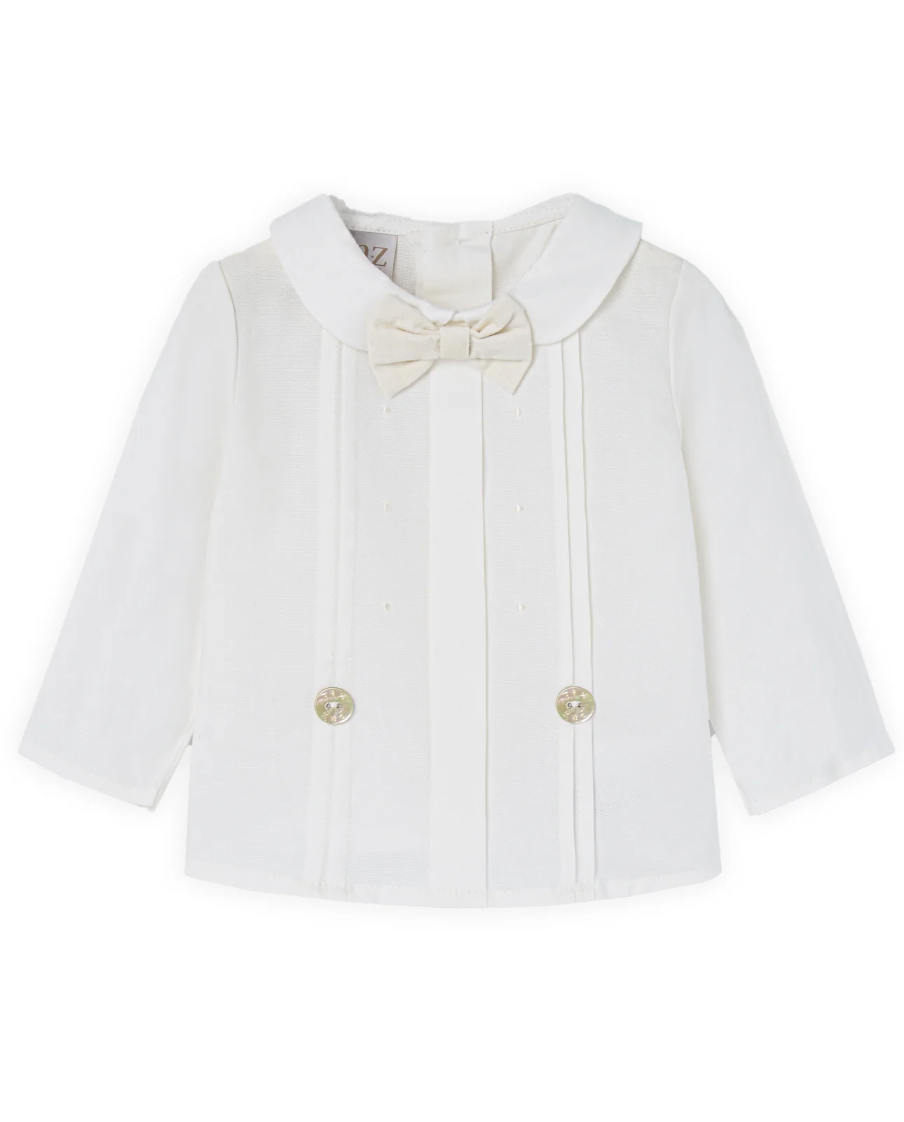 Blusa de niño con pajarita extraíble a tono, confeccionada en tejido liso. Cuello camisero y abotonadura delantera. Manga larga con puños y corte recto. Una prenda pensada para momentos especiales dentro de la colección PAZ OI 25-26.