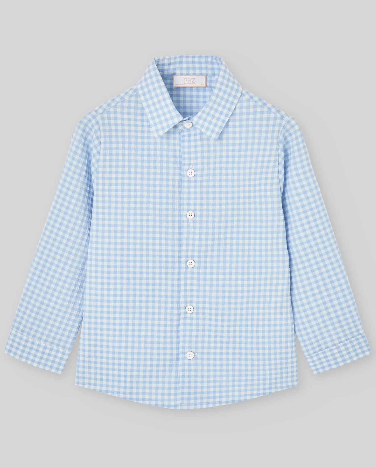 Camisa infantil de manga larga con estampado vichy azul. Con cuello clásico y cierre de botones, es una prenda esencial y atemporal para cualquier ocasión.