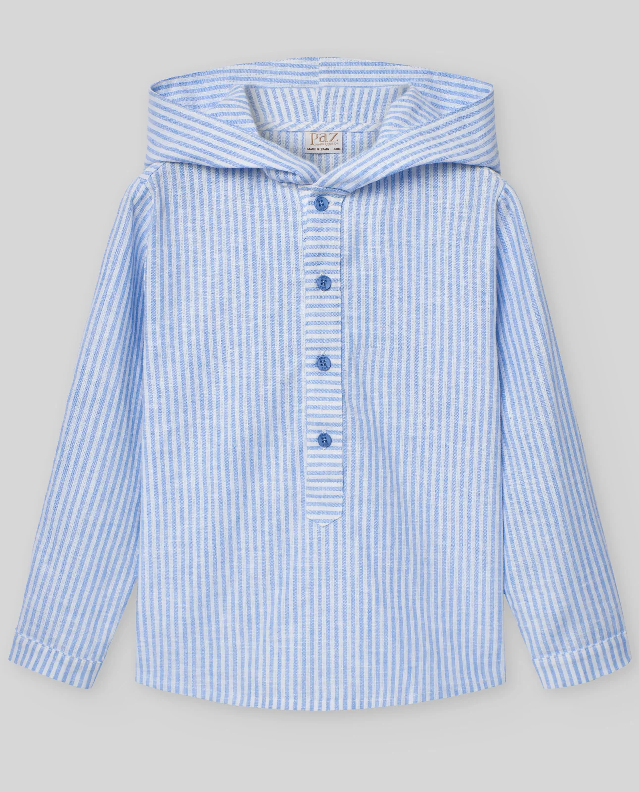 Camisa con capucha para niños en tejido a rayas. Con trabilla y botonadura en el delantero. Puños abotonados. Manga remangable mediante pieza abotonada. Bajo ligeramente redondeado.