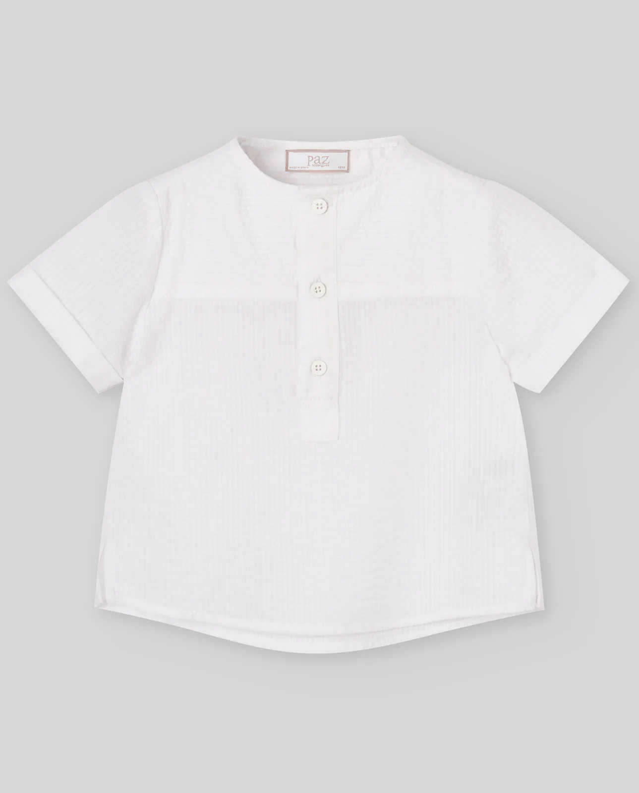 Camisa de manga corta para niño en tejido seersucker con cuello mao. Su textura ligera y el diseño limpio ofrecen frescura y comodidad durante todo el día.