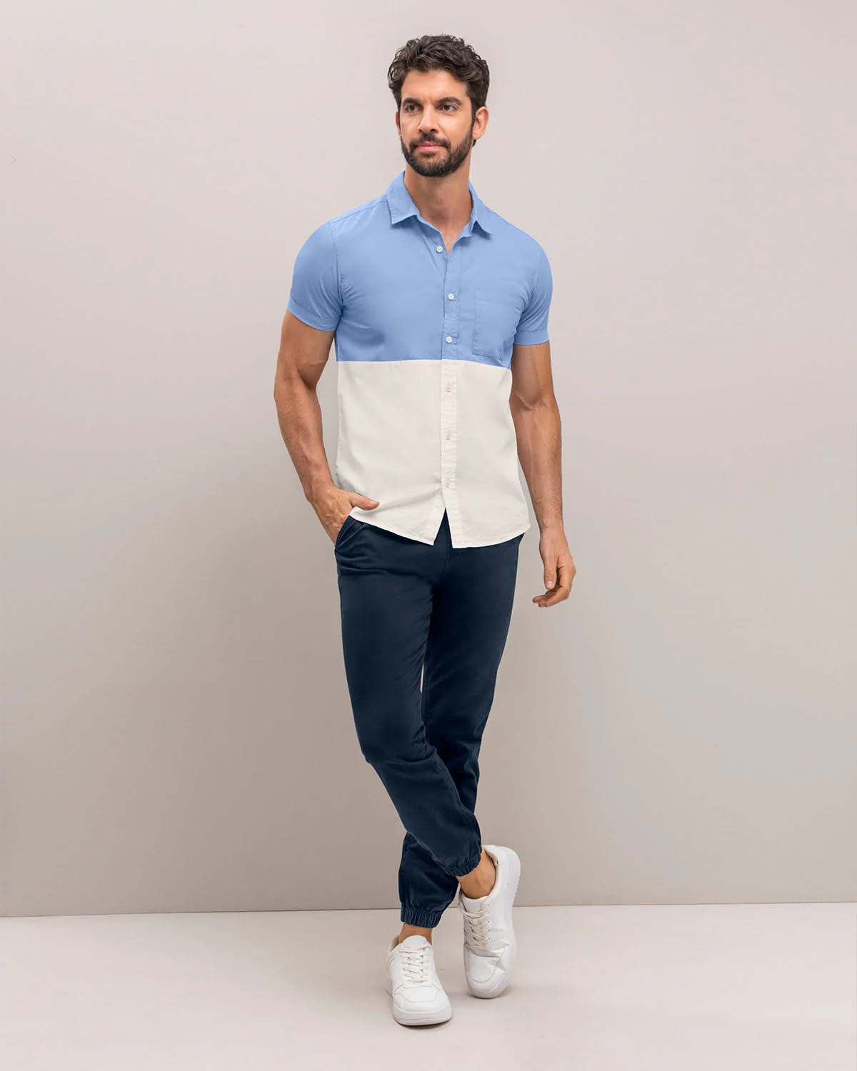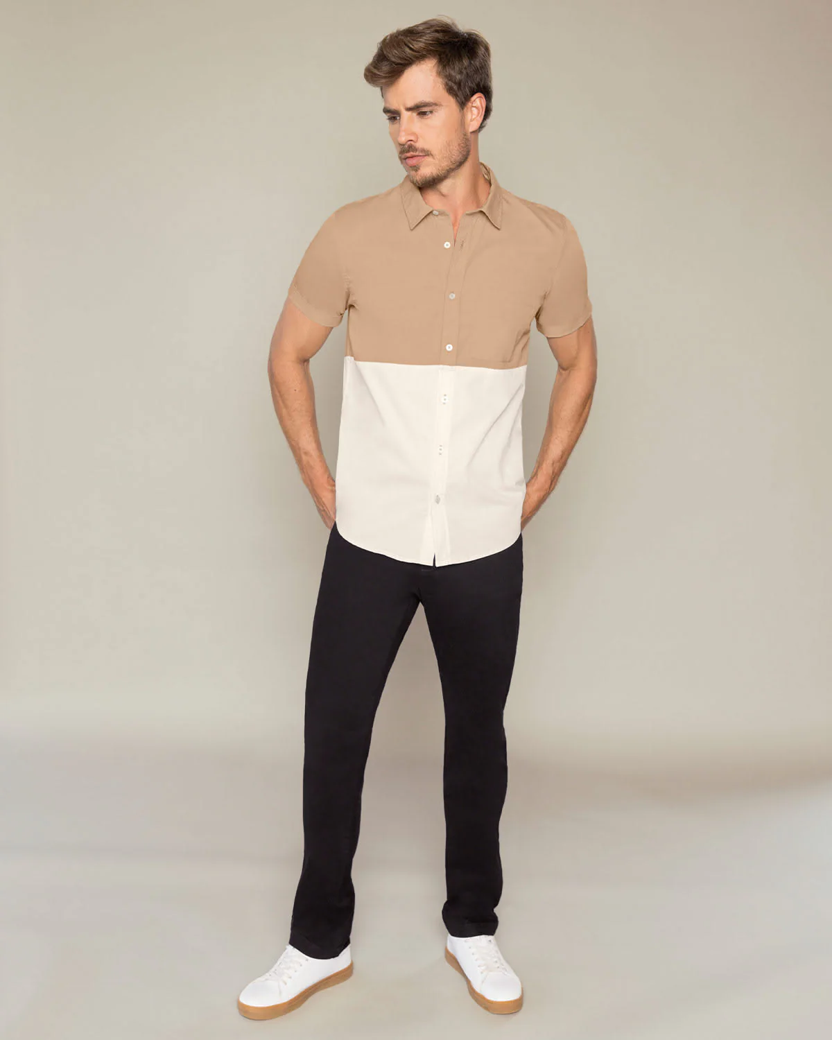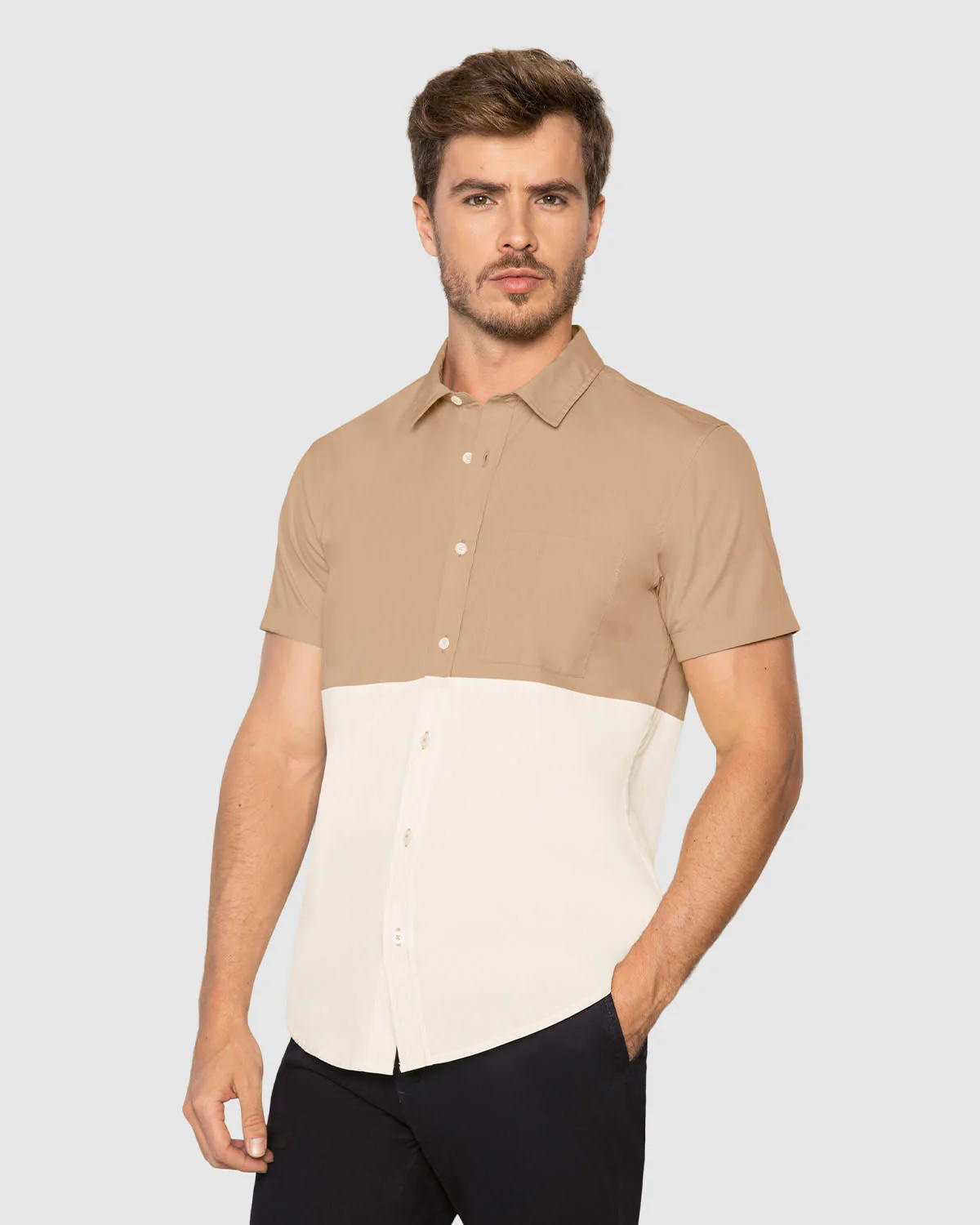 Esta camisa manga corta será una opción siempre que no sepas qué ponerte. Cuenta con perilla funcional y cuello camisero. Además, para un toque de diseño tiene bloques de color. Úsala con nuestros jeans de la temporada.