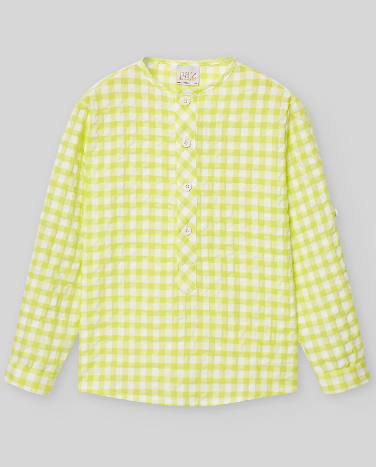 Camisa para niños de manga larga, en tejido seersucker con estampado vichy. Con trabilla y botonadura en el delantero. Puños abotonados y cuello redondo sin solapas. Manga remangable mediante pieza abotonada.