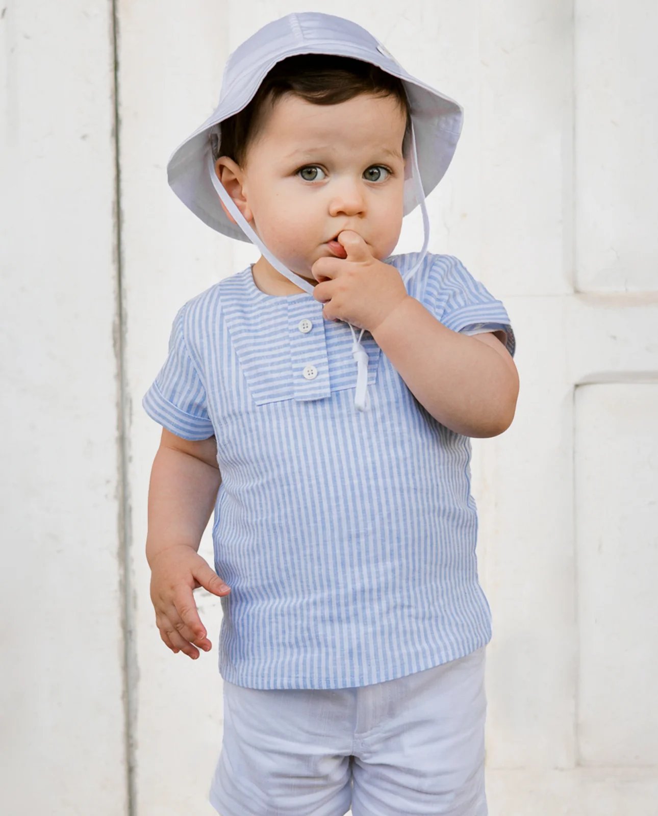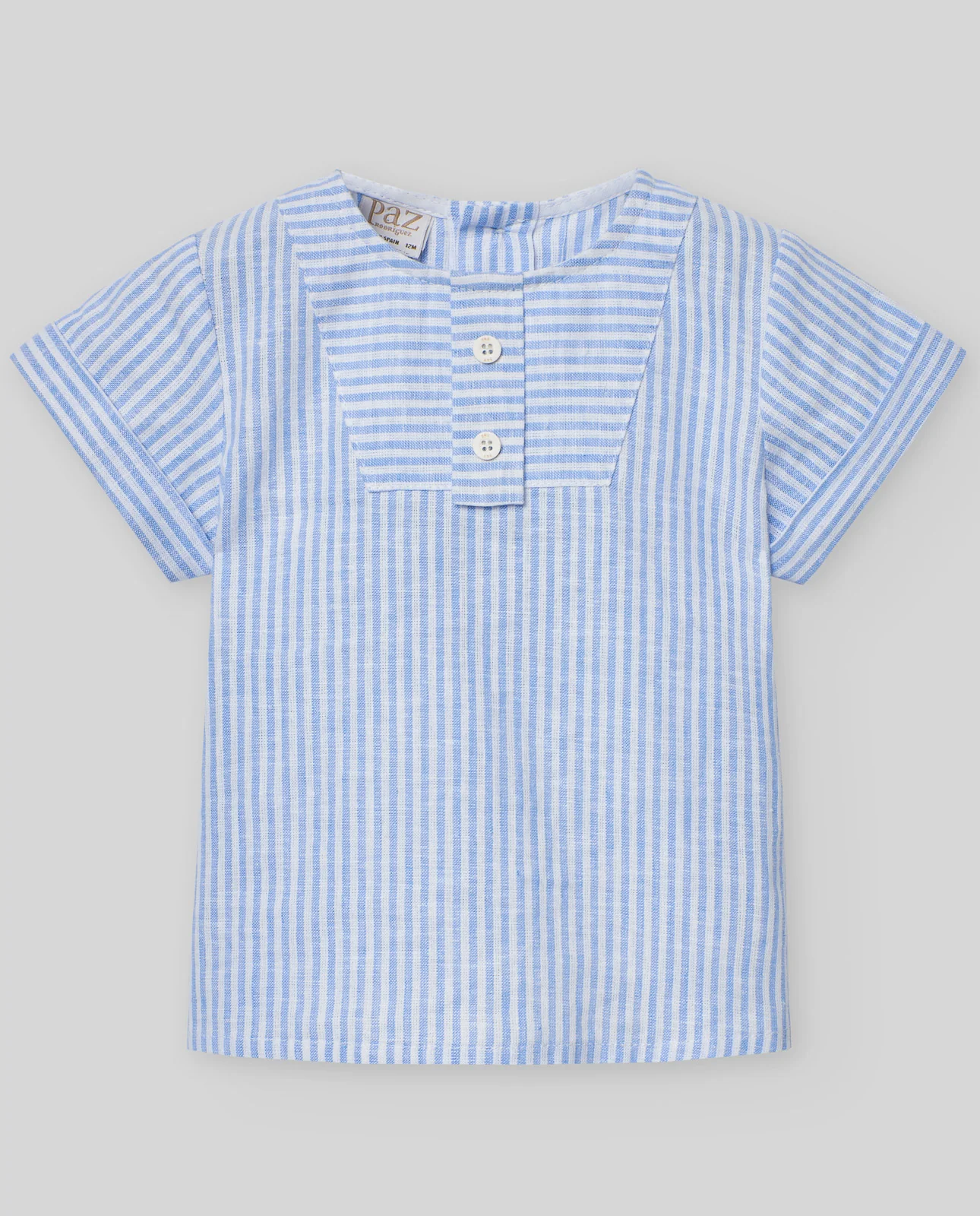 Blusa para bebé niño de manga corta, en tejido a rayas. Trabilla decorativa con botones en el delantero y mangas vueltas. Cierre trasero con botones.