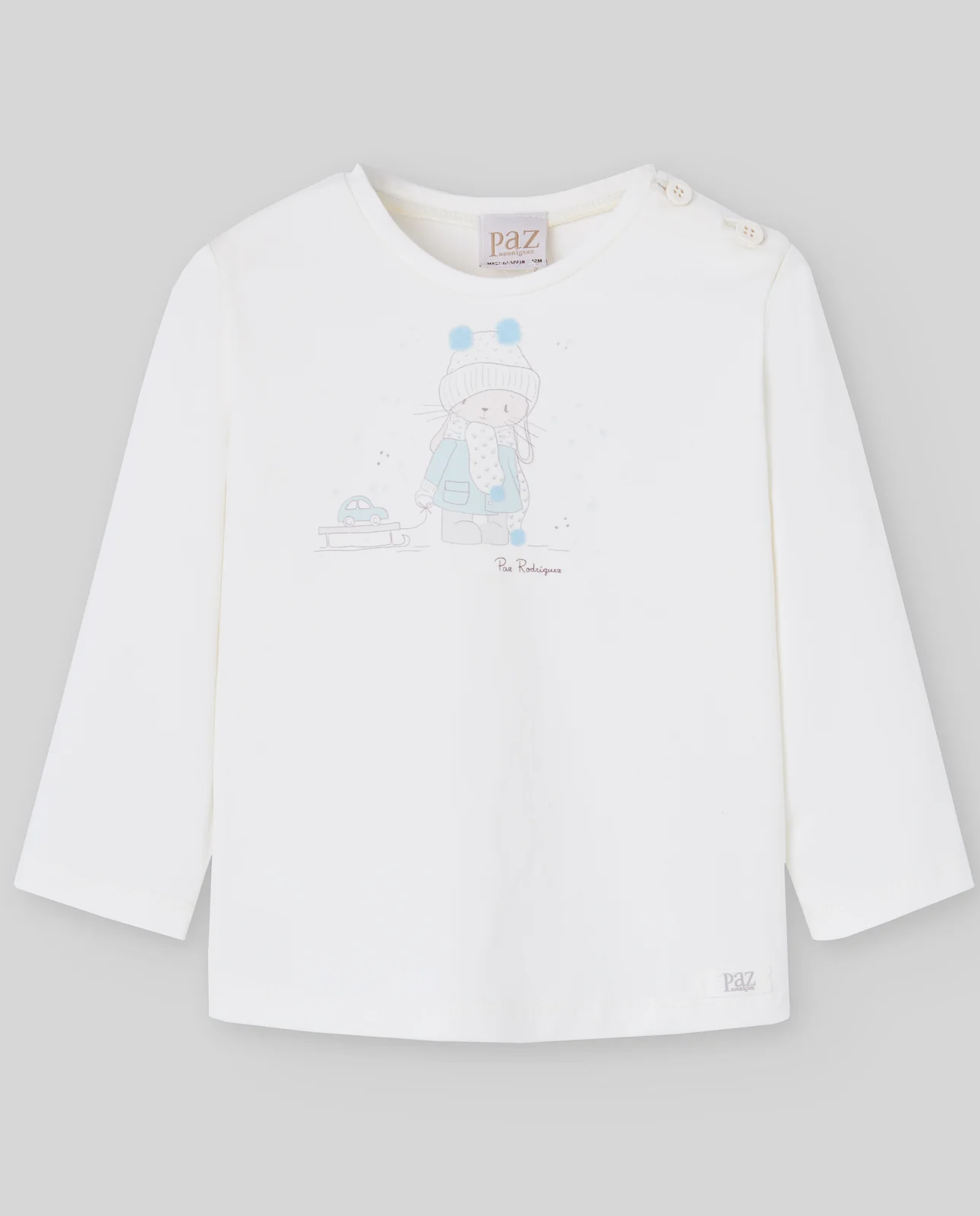 Camiseta de niño con serigrafía central de inspiración infantil. Cuello redondo y botones en hombro para vestir con facilidad. Un diseño cómodo para looks cotidianos con un toque tierno.