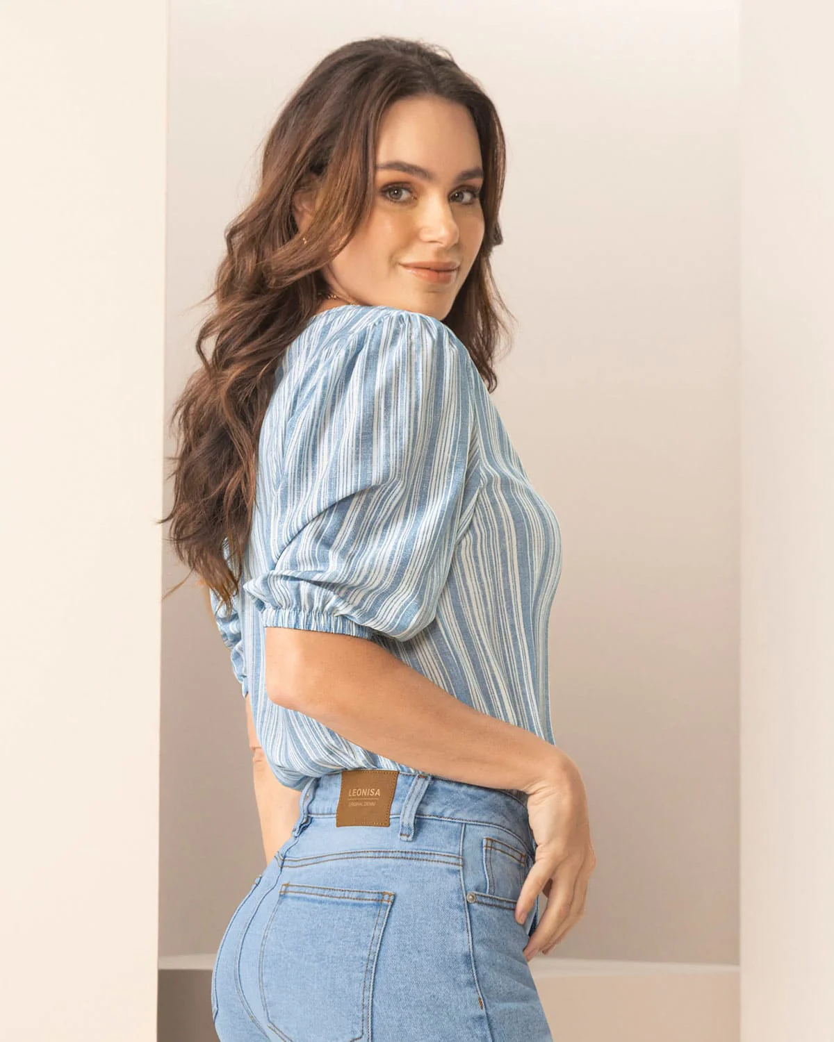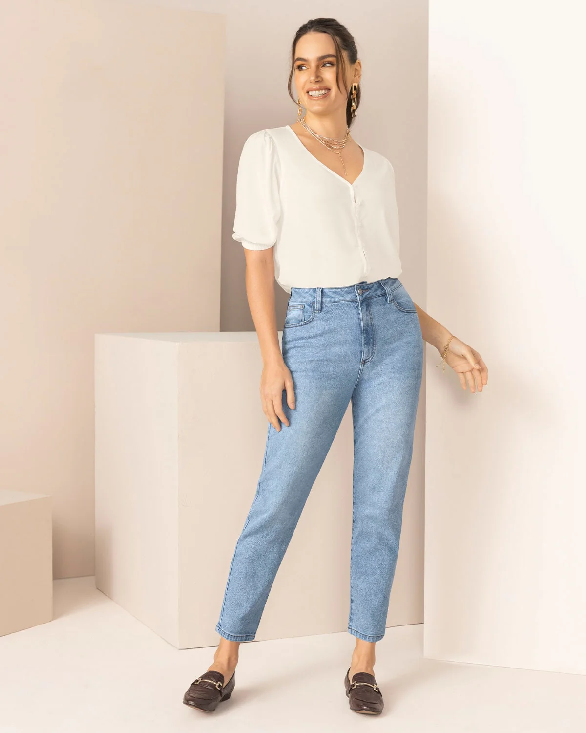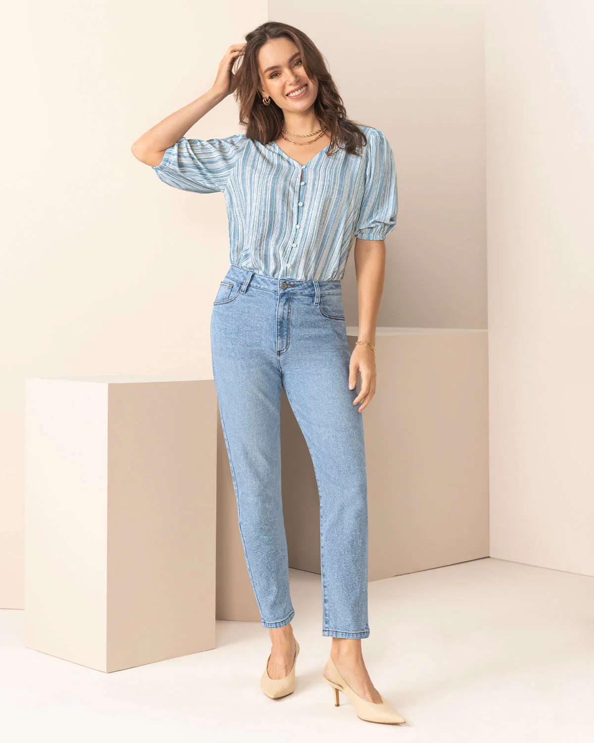 Esta camiseta manga 3/4 con botones con ojales, es la definición ideal de versatilidad y estilo. Cuenta con recogido en hombros y elástico en los puños que crean un sutil efecto de volumen, para darle a tus looks un toque más elegante. ¿Casual con jeans o sofisticada con falda? Tú decides.