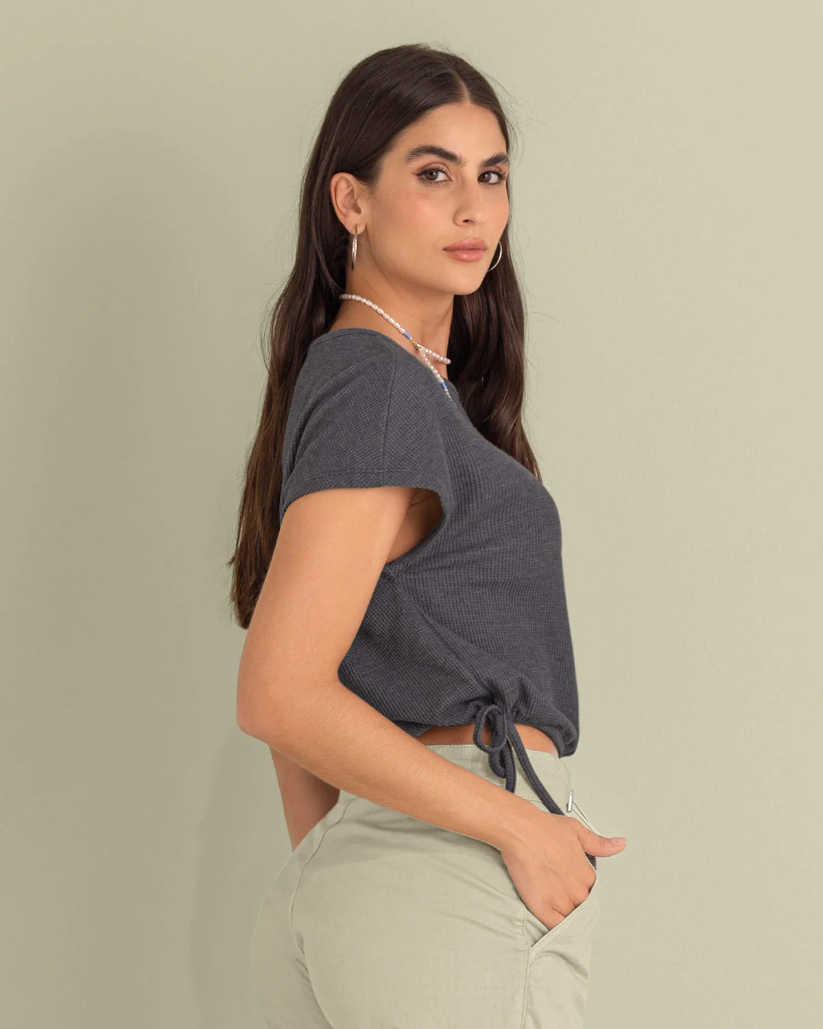¡El verano está llamando a tu puerta! Y esta camiseta manga corta de silueta tipo boxy, es la prenda perfecta para dejarlo entrar. Con mangas amplias y fluidas, y tira para ajustar en cintura, es perfecta para todos tus looks casuales. ¡Úsala con unos shorts en denim y quedarás lista para los días de sol!