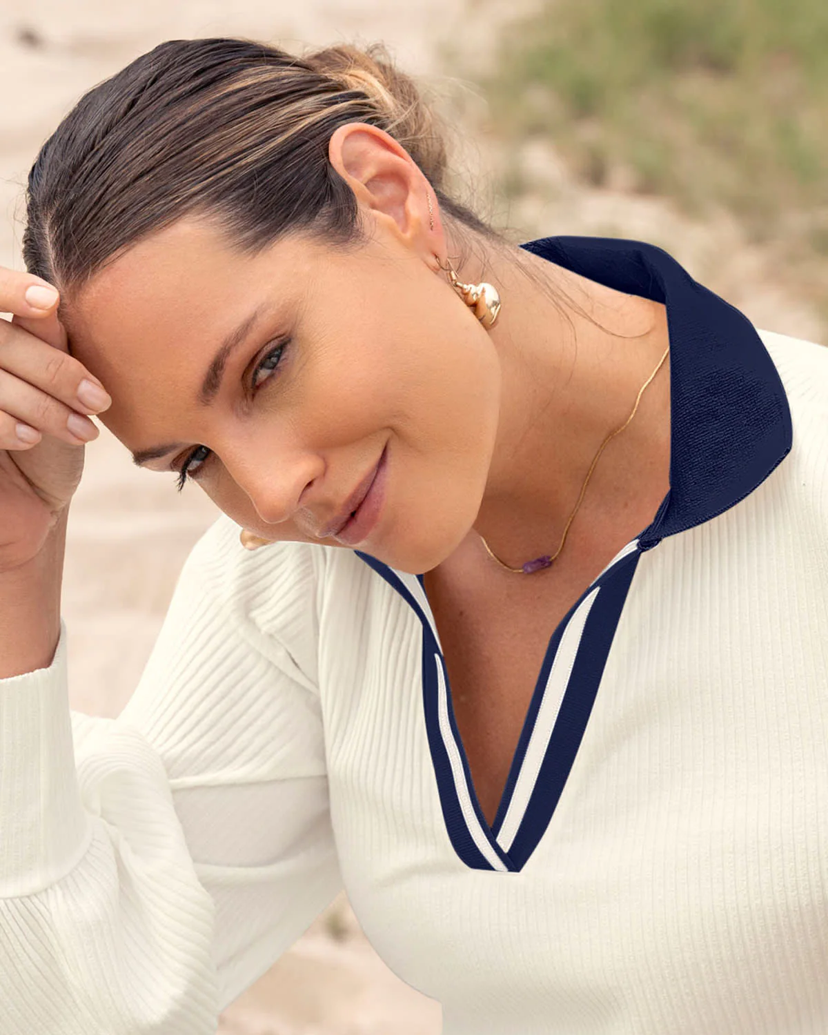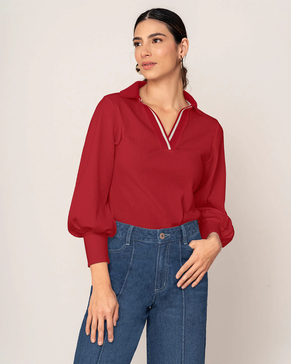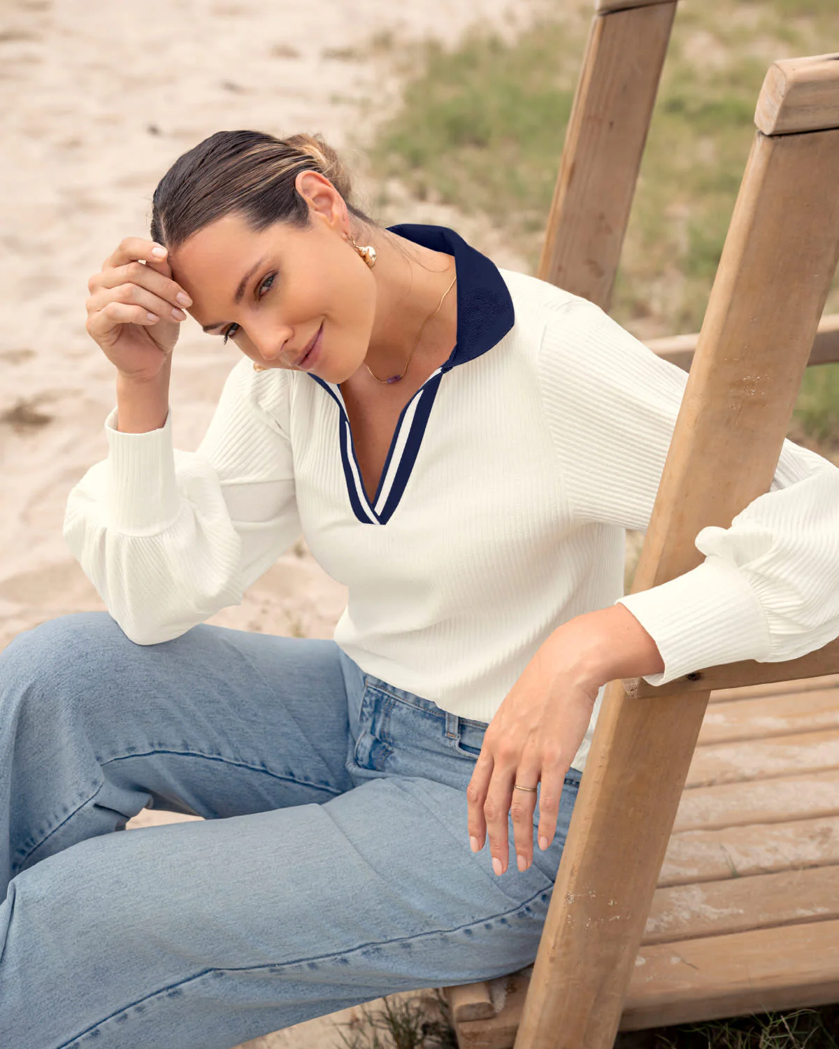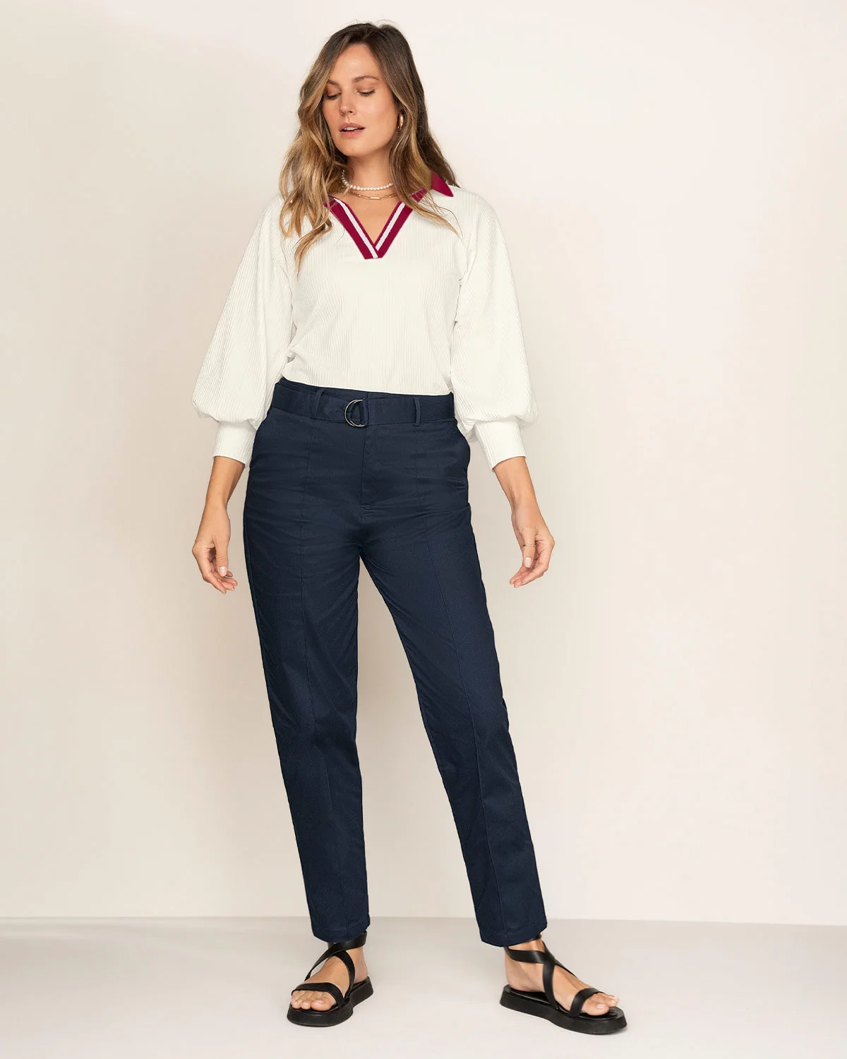 Azul y a rayas: ¡la tendencia náutica siempre está de moda! Esta camiseta manga larga es necesaria en todo armario. Cuenta con cuello tejido y tela acanalada. Además sus mangas tienen puños que generan volumen. Combínala con nuestros pantalones y jeans y tendrás tu clóset cápsula.
